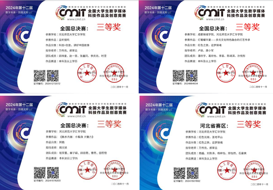 全国大学生数字媒体科技作品及创意竞赛由中国人工智能学会和全国大学生数字媒体科技作品及创意竞赛组织委员会共同主办,入选2024年教育部中国高等教育学会大学生学科竞赛排行榜单。在此次竞赛中,传媒学部2022新闻学专业祖笑蕾团队作品《衡水内画:小瓶身 大魅力》、2023级广告学专业邱炜童团队作品《且听铜鸣》、2023级广告学专业孙悦彤团队作品《灯蜀耀华夏——多元文化特色融合的灯艺传承》喜获国赛三等奖、河北省省赛二等奖。2022级新闻学专业商越团队作品《红色光禄,圣地平山》获得河北省省赛三等奖。