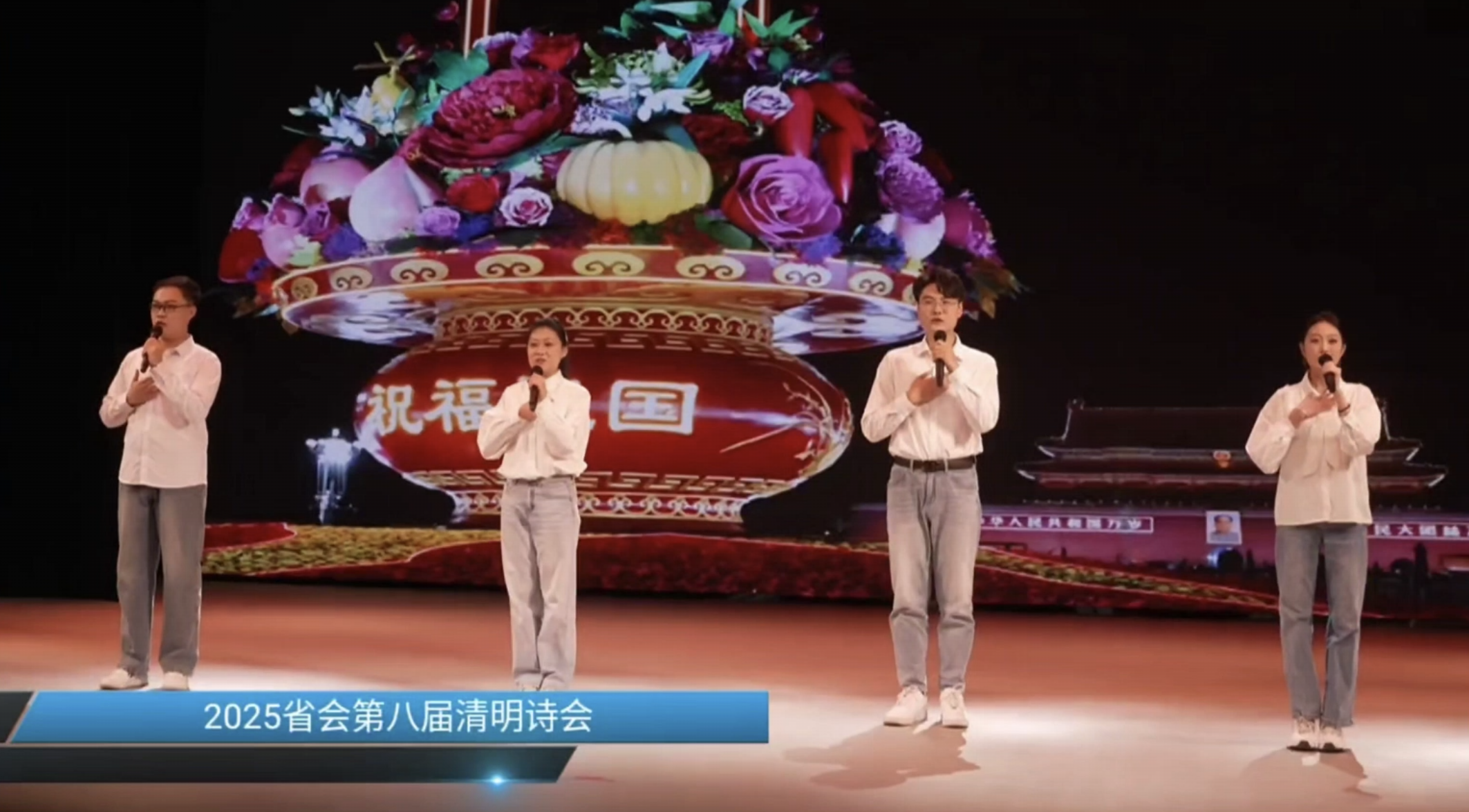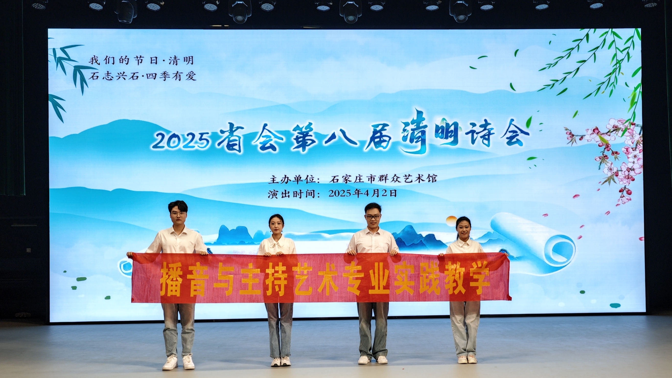 4月2日,河北省第八届清明诗会在石家庄市群众艺术馆举行。我学部2022级与2023级播音与主持艺术专业的吴姿佳,刘欣芮,高嘉辰,石豪爽四名学生,以原创朗诵作品《祖国,是什么让我对你如此痴迷》登上省级舞台。这是该作品继2024年学院迎新晚会首演后,首次走向更广阔的艺术平台。