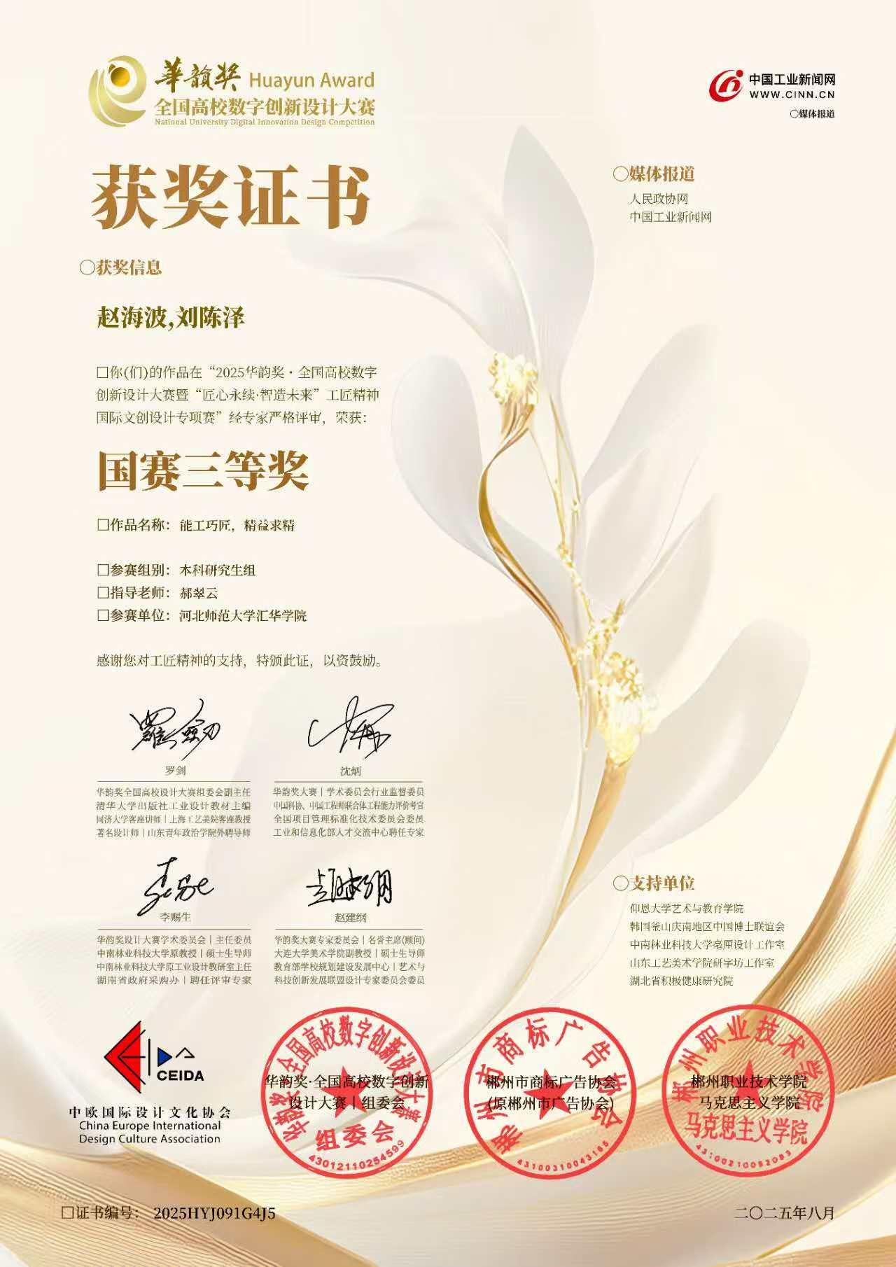 8月20日,2025华韵奖·全国高校数字创新设计大赛暨“匠心永续·智造未来”工匠精神国际文创设计专项赛获奖名单揭晓。传媒学部刘陈泽同学与艺术学部赵海波同学合作创作的作品《能工巧匠,精益求精》凭借出色表现,荣获全国总决赛三等奖。
