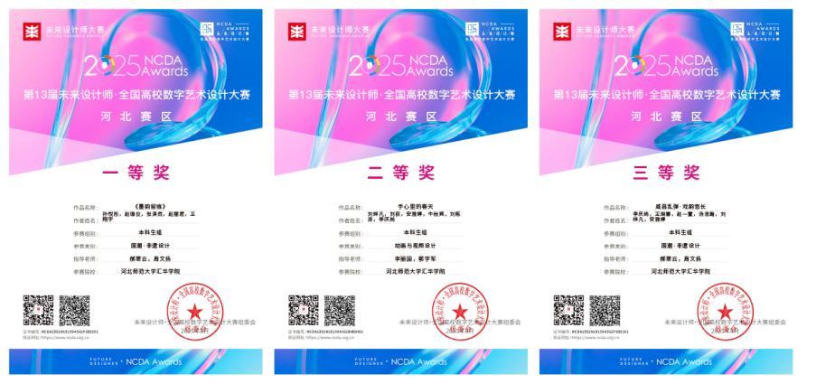 2025年第13届未来设计师·全国高校数字艺术设计大赛(NCDA)河北赛区竞赛结果正式公布。传媒学部学子凭借深厚专业功底与创新设计思维,在赛事中脱颖而出,斩获省级一等奖、二等奖和三等奖各一项。