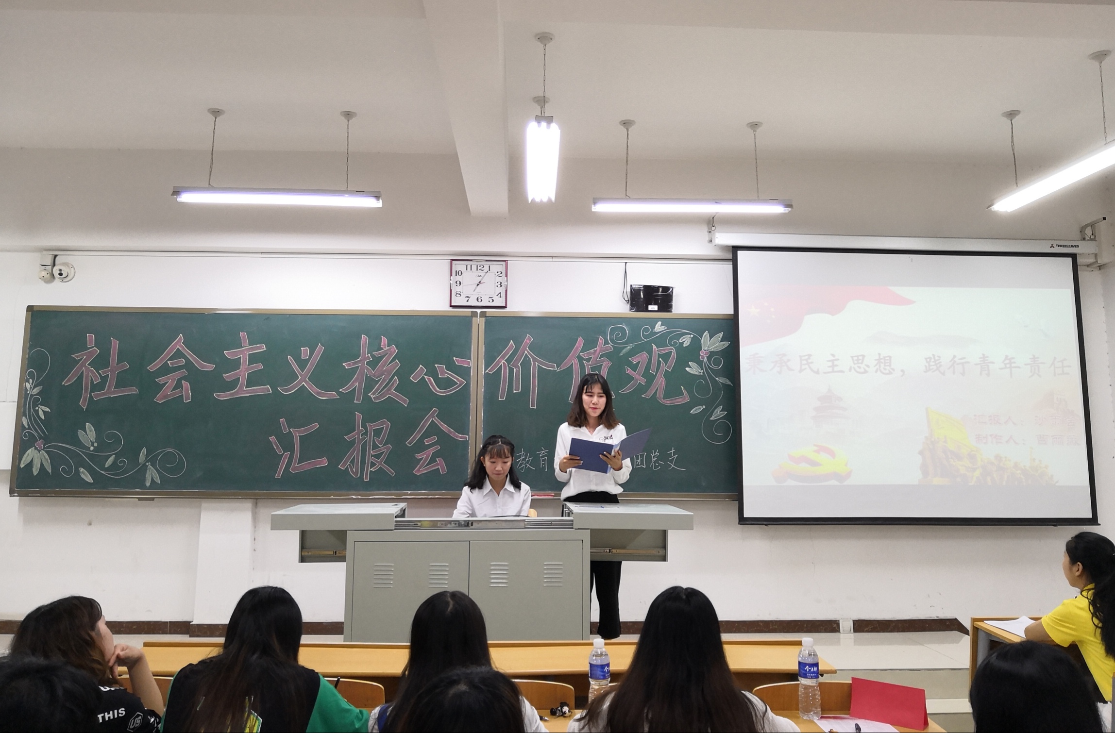 教育法政学部举办“践行社会主义核心价值观”成果汇报会-缩小 放大+ 2018-06-26为认真落实习近平总书记关于“青年要自觉践行社会主义核心价值观”的号召,不断提高大学生干部等青年群体的思想道德修养、科学文化素质、理论研究水平,6月21日晚,教育法政学部在第六教学楼305教室举办了“践行社会主义核心价值观”成果汇报会,参加第三期培训班的100余名学生干部聆听了本次汇报。 本次活动共有12个组展示成果,他们分别从富强、民主、文明、和谐、自由、平等、公正、法治、爱国、敬业、诚信、友善十二个词语分别展开相关内容的汇报。其中,2016级徐嘉琪以《中国梦,富强梦》为题,她提到富强即国富民强,是社会主义现代化国家经济建设的应然状态,是中华民族梦寐以求的美好夙愿,也是国家繁荣昌盛、人民幸福安康的物质基础,只有国家富强,国民才能得到尊重;2016级刘冰冰用“千里修书为一墙,让他三尺又何妨?”的典故巧妙的提出“构建和谐社会,共创美好生活“的中心思想,并同时提出,和谐是经济社会和谐稳定、持续健康发展的重要保证等重要观点;2017级艾晓晴以“洁洁良”事件进行对比反思,提出“莫要挑战爱国底线“的爱国宣言,呼吁当代青年以振兴中华为己任,促进民族团结、维护祖国统一、自觉报效祖国。在场学生无不认真聆听,掌声不绝于耳。