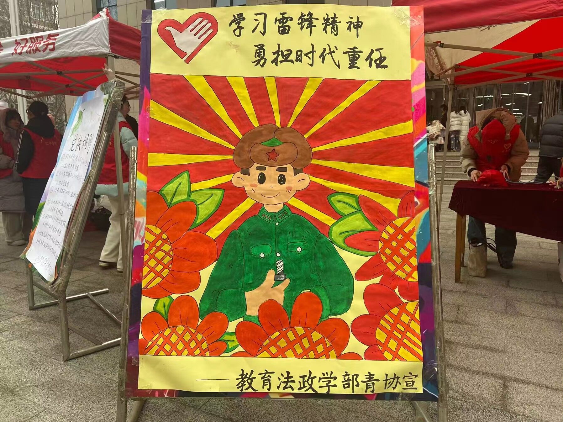 三月春光媚,“锋”暖润心扉。为弘扬和发展雷锋精神,加强大学生思想道德建设,此次活动特此开展。活动开始后,志愿者们向同学们介绍了此次活动的开展形式,传递了学习雷锋精神的活动宗旨,同时,志愿者们展示了大家共同制作的雷锋展牌,吸引了众多同学驻足观看,雷锋精神也从展牌中奔涌而出,涌入同学们的心中,鼓舞同学们阔步前行。此外,志愿者们还准备了扭扭棒,将其制作成各种形状,将这份礼物送给前来参与活动的同学们。在此次宣传教育活动中,参与同学纷纷表示雷锋精神也牢牢根植在了他们的心中。
