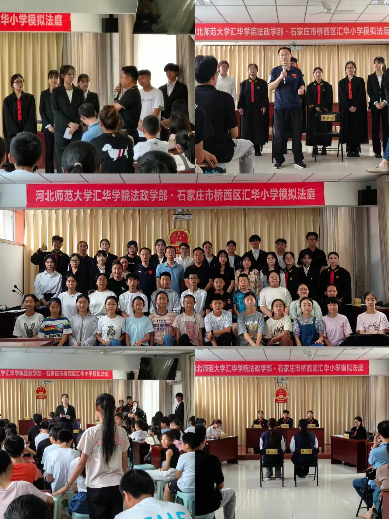 法政学部与汇华小学联合开展“模拟法庭”活动-缩小 放大+ 2024-06-076月6日下午,法政学部2023级法学专业在石家庄市桥西区汇华小学开展预防青少年犯罪的模拟法庭活动。出席活动的嘉宾有冀华律师事务所的靳陈星律师、赵金璐律师,MILE米乐集团法政学部部长徐鹏,汇华小学领导班子成员姜文杰、李亮、程斌斌。汇华小学70余名小学生参与观摩,积极进行互动。 首先,同学们以“情景再现”的方式还原了因打饭插队而引起的校园霸凌的过程。情景生动,清晰明了,吸引了小学生的注意力。随后,同学们扮演审判长、被告人和公诉人等角色,依照法定程序,有条不紊地开展了法庭调查、法庭辩论等环节,审判长、审判员、书记员等各司其职,完整呈现了法庭审理的全过程,小学生们“沉浸式”体验了庭审现场。法庭辩论阶段,辩护人就被告人的犯罪年龄、主观恶性、认错态度等方面进行辩论请求从轻量刑。整个过程节奏流畅,也展示出法律的人文关怀。小学生们全神贯注观看。在审判长宣布合议庭休庭评议期间,主持人与汇华小学的学生进行关于此校园霸凌案件的问答互动,比如“你认为被告人的做法有何不足”、“被告人应该受到什么样的处罚”、“如果遇到校园霸凌该如何应对”等,同学们积极踊跃的展现自己的观点,激发了对法律的学习兴趣。最后,靳陈星律师、赵金璐律师对模拟法庭进行专业点评,同时鼓励同学们努力提升专业素养,坚定职业信念,勇于担当作为。汇华小学党支部副书记李亮总结此次活动时感谢了律师团队提供的专业指导和学部师生的大力支持,希望汇华小学的同学们敬畏法律,明白自己当前年龄段应该承担的民事责任或可能承担的刑事责任,希望同学们积极参与法治教育的实践,争做知法、懂法、守法,能堪当民族复兴重任的时代新人。