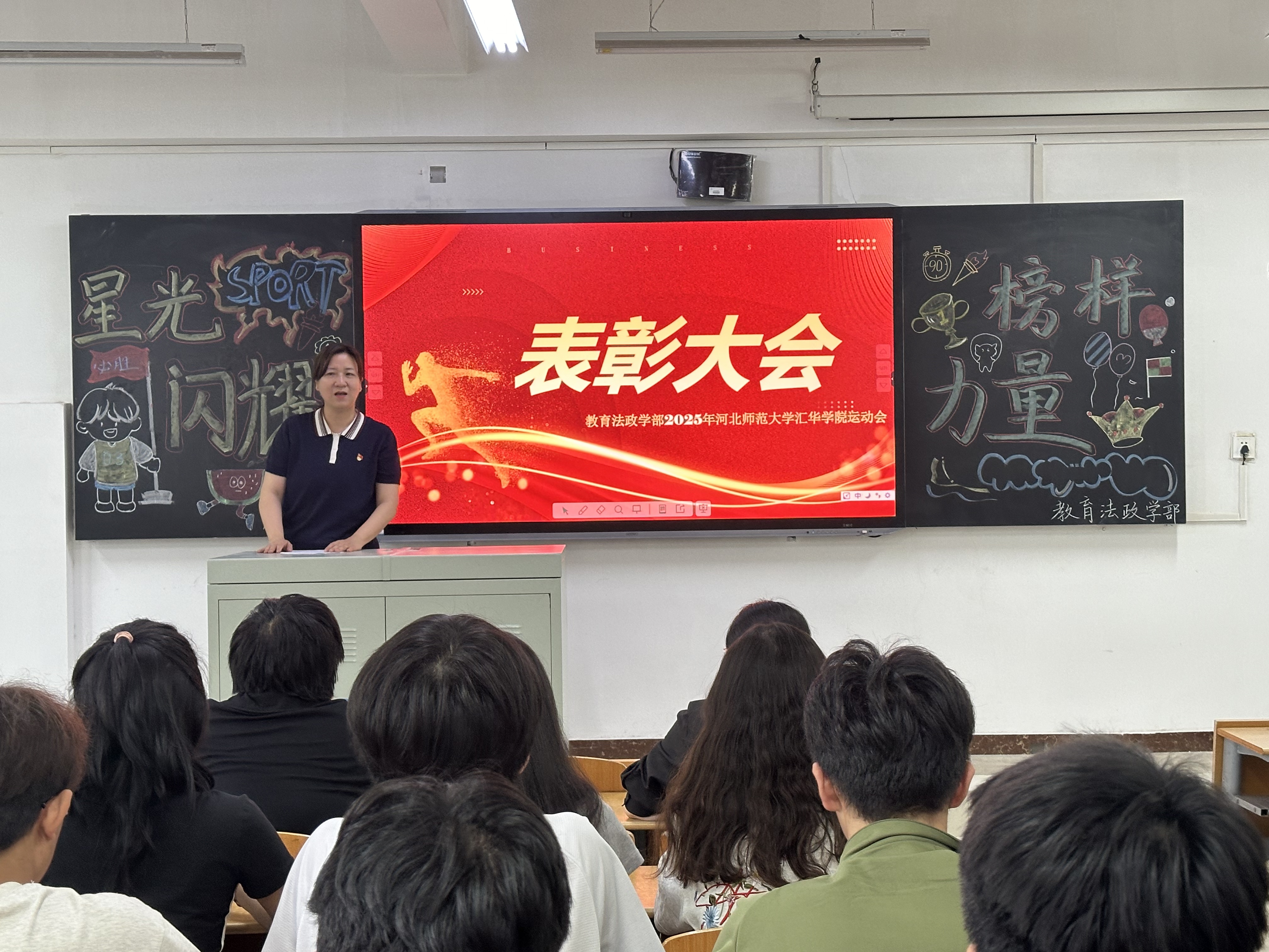 学部成功举办2025年运动会表彰大会-缩小 放大+ 2025-06-066月5日,学部在第六教学楼305教室隆重举办2025年运动会表彰大会,对在校运会中表现优异的同学进行了表彰。学部部长武新慧、副部长刘媛、范玉茹,团总支书记张振伟,以及运动员、开场舞表演代表、运动会工作人员共计70余名师生参会。 一、重温赛场激情,彰显教法力量 大会以一段运动会精彩短片拉开序幕,画面中短跑健将如离弦之箭、跳高选手凌空跃起、接力团队默契协作的场景,重现了运动会的激情时刻。尤为瞩目的是,21级小学教育1班的程楚楚以绝对优势蝉联女子1500米冠军同时斩获800米金牌;23级法学专业李沂珈在男子800米中突破自我摘得亚军;女子4×400米接力队凭借协作摘银;22级法学专业刘鸿灵以稳健发挥获铅球亚军。全体法政学子凝心聚力,最终斩获女子团体总分第三名,并蝉联“体育道德风尚奖”,充分诠释了学部“崇法尚德、奋勇争先”的精神内核。 二、表彰先进典范,凝聚奋进共识 学部部长武新慧在致辞中高度评价全体师生的拼搏精神与团队协作,强调“赛场上的坚持与互助,正是教法学子应对未来挑战的宝贵品质”。她提出三点期望:一是将体育精神融入学习生活,以坚韧态度直面困难;二是深化团队协作,构建互助共赢的成长生态;三是强化集体荣誉感,以健康体魄为全面发展筑基。
