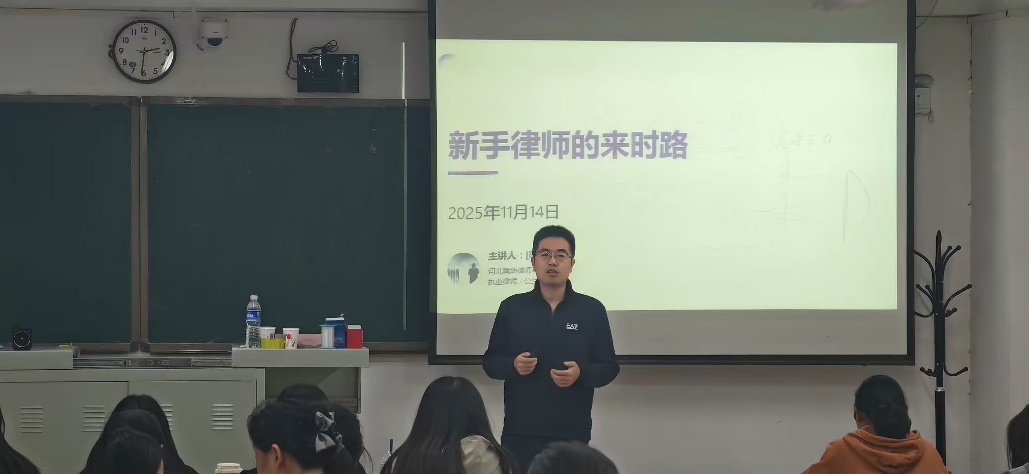 法政学部举办“双师同育,赋能增长”律师进课堂系列活动第三讲-缩小 放大+ 2025-11-1811月14日下午,法政学部"律师进课堂"系列活动第三场在第六教学楼403教室顺利举行。河北冀华律师事务所陈世超律师受邀担任主讲,2023级法学专业一班全体学生参与活动。 陈世超律师以"从工科生到专职律师的转型之路"为主题,结合自身经历展开分享。他详细回顾了从工科背景跨界法律行业的职业历程,通过"四年四阶"完成了从法考到独立执业的蜕变。讲座中,陈律师金句频出:"吃不了学习的苦,可能要吃生活的苦"的警示发人深省;提出的"双筛法则"(选导师、定方向)和"成长三角模型"(专业知识、法律工具、服务意识)为同学们勾勒出清晰的职业发展路径。针对法考准备,他强调动机明确和时间规划的重要性,并以"人生没有白走的路,每一步都算数"作结,引发全场共鸣。 本次活动不仅展现了法律职业发展的多元可能,更通过陈律师的亲身经历,让同学们深刻认识到:法律人的成长既需要专业能力的持续精进,更需要服务意识的培养和职业信念的坚守。未来,期待更多法律人走进课堂,用经验点亮方向,让成长有迹可循。