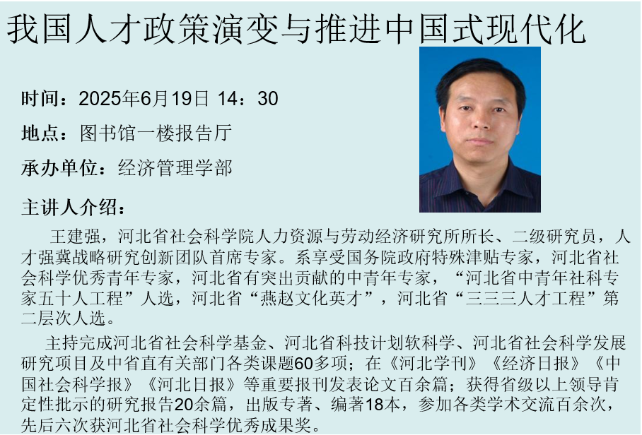 主讲人简介:王建强,河北省社会科学院人力资源与劳动经济研究所所长、二级研究员,人才强冀战略研究创新团队首席专家。系享受国务院政府特殊津贴专家,河北省社会科学优秀青年专家,河北省有突出贡献的中青年专家,“河北省中青年社科专家五十人工程”人选,河北省“燕赵文化英才”,河北省“三三三人才工程”第二层次人选。