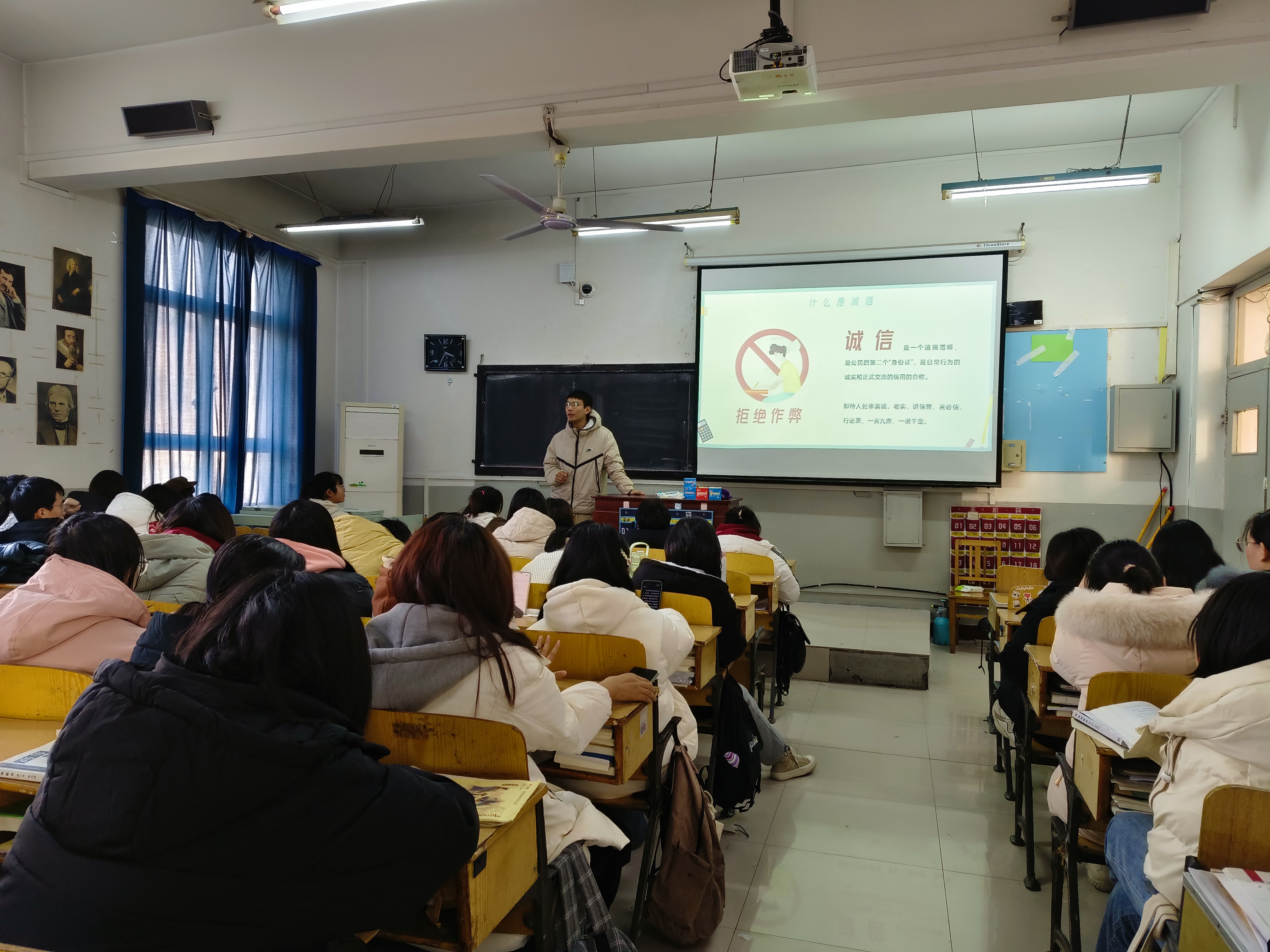 为了弘扬诚实守信的优良学风,培养良好的考试风气,让同学们深刻理解诚信的重要性,自觉遵守考试纪律,真正将诚信为人、诚信做事内化于心。2023级物理学1班于2024年1月2日在第二教学楼411教室开展了“学以载道,诚信为本”的主题班会,辅导员郭世超老师以及23级物理全体学生参与本次会议。 活动在郭世超老师的发言中拉开序幕。郭世超老师通过生动的例子,深入浅出地讲解了诚信的重要性,并强调诚信是每个人品格的基础,是同学们成长道路上的指南针,作弊不仅会影响自己顺利毕业,还会破坏公平竞争的环境,影响整个理学部的道德风气,警示大家要杜绝作弊行为。之后,班长郑毅朗读了倡议书,呼吁同学们端正态度,诚信应考。他强调了考试是检验学习成果的重要手段,而诚信则是考试的基石,鼓励同学们要树立正确的价值观,坚持诚实守信的原则,不仅在考试中表现出色,更要在日常生活中做一个诚实守信的人。借着这股东风,全体同学进行了庄重的诚信宣誓,承诺将严格遵守考试纪律,坚决抵制任何形式的作弊行为。宣誓结束后,每位同学都签署了一份承诺书,表明他们将以诚信为准则,严格遵守考试纪律,坚决抵制任何形式的作弊行为。最后,全体同学在“诚信种下希冀,勤奋采撷佳绩”的条幅上签下了自己的名字,以此表达自己的决心和信念。这个条幅被挂在班级门口,时刻提醒着每个人要保持诚信的态度,努力取得优异的成绩。