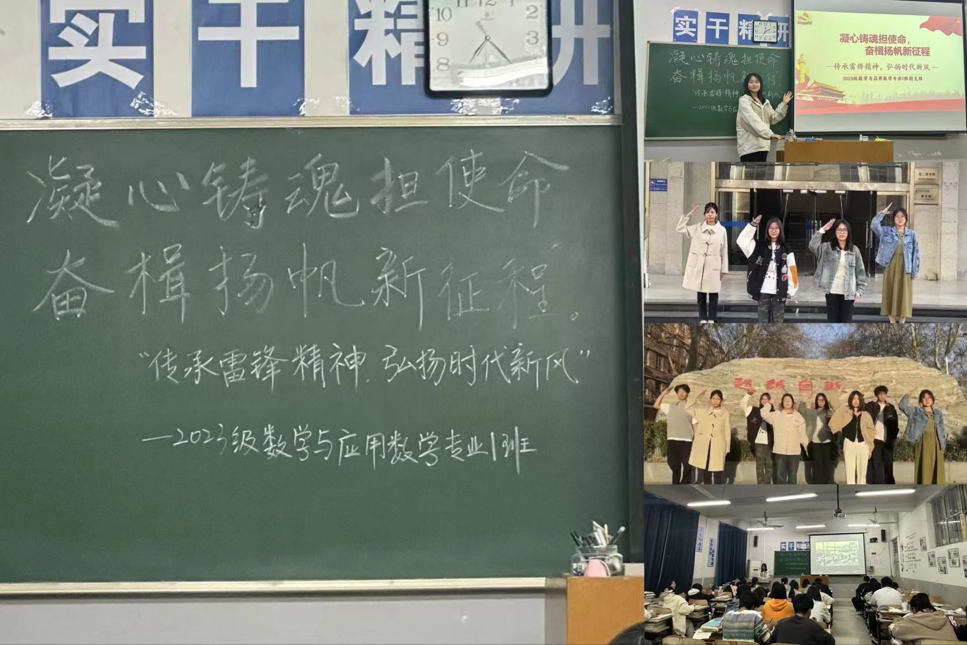 2024年是学雷锋的第61周年,为进一步弘扬新时代雷锋精神,培养同学们树立正确的世界观、人生观、价值观,引导同学们服务社会,成就自我,倡导“向雷锋同志学习”的良好风尚,2023级数学与应用数学1班成功举办了“春风十里,不如学雷锋的你”学雷锋月系列活动。 三月是雷锋月。为了使雷锋精神春风化雨,润人心田,此次活动分为两个部分,主题班会及手势舞的表演。在学雷锋主题班会上,同学们于班级文化氛围中得到熏陶,进一步感悟了雷锋精神,寻找雷锋“足迹“,发现身边的好人好事;同时同学们也受到了鼓励,积极从身边小事做起,让雷锋精神深入到生活各方面。为让同学们进一步地了解雷锋精神的真谛,重温雷锋的故事,学习雷锋感人的事迹和无私的美德,团支书吕若瑜同学在班会上给同学们播放了三个简短的视频,分享了雷锋同志高尚的品质和博爱的精神,并引导同学们积极传承雷锋精神,营造浓厚的学雷锋、树新风的氛围,使同学们感悟到了雷锋精神的实质——做最好的自己,关爱他人。除此之外,我们还进行了红色记忆——学习雷锋好榜样手势舞的表演活动,在全班掀起了学雷锋、献表演的热潮,充分展示出同学们朝气蓬勃、奋发向上的精神风貌。 奋进新时代,阔步新征程,2023级数学与应用数学1班定将大力弘扬雷锋精神,用爱心和善举、用行动和汗水,学习雷锋,树立新风,让雷锋精神代代传!勇做实现中华民族伟大复兴的先锋,让雷锋精神在为党和人民、为国家和民族的不懈奋斗中绽放出绚丽之花!