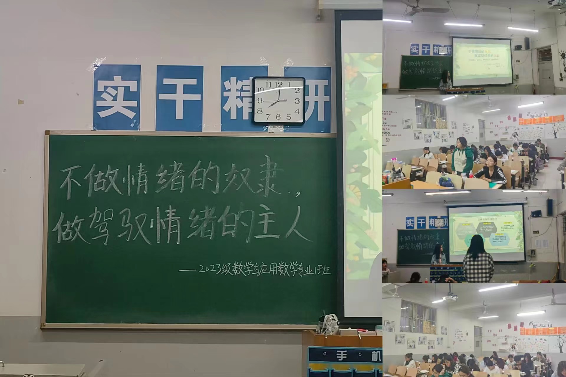 为进一步推进心理健康知识普及,促进同学们身心的健康成长,帮助同学们了解正确的心理健康知识,提高情绪调控能力,加强班级心理健康教育工作,全面提高同学们的心理素质,营造良好的心理健康教育氛围,2023级数学与应用数学1班于2024年4月14日在二教401教室召开了以“不做情绪的奴隶,做驾驭情绪的主人”为主题的大学生心理健康教育主题班会。 会议伊始,生活委兼心理委崔佳宇采用问题式导入法引导同学们进入本次的专题,然后从四个方面具体展开:一是什么是情绪及情绪种类有哪些;二是情绪对我们的影响及作用;三是如何做“驾驭情绪的主人”;四是如何感知不良情绪及怎样调控情绪。崔佳宇同学多次引用一些经典案例和生动形象的故事,在调动大家积极性的同时,也使同学们在轻松愉快的气氛中收获了许多,现场气氛非常热烈。最终,在同学们的积极参与与配合之下,本次的心理健康教育主题班会取得了圆满成功。
