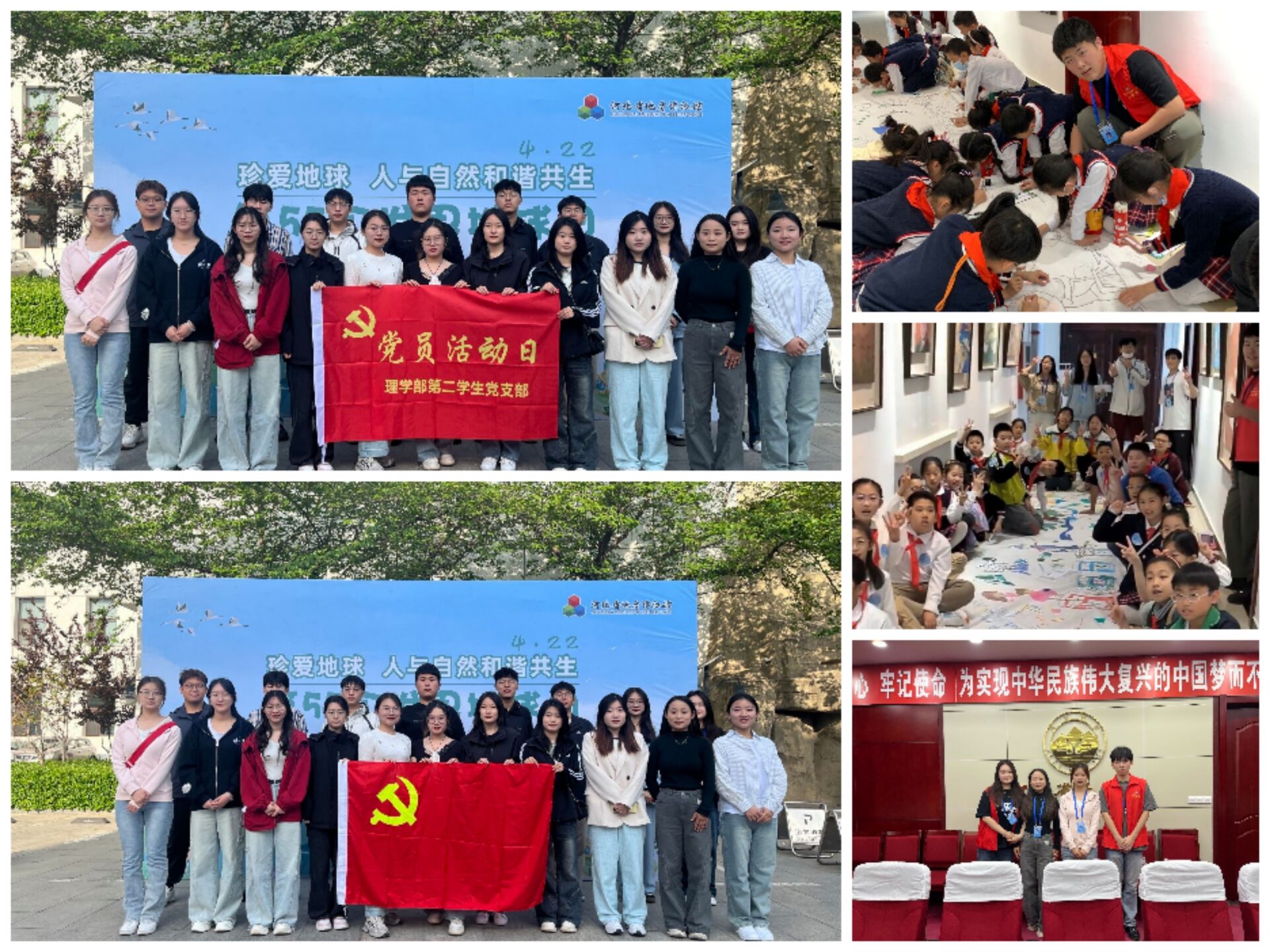为深入学习贯彻习近平生态文明思想,引导全社会树立“尊重自然、顺应自然、保护自然”的生态文明理念,动员社会公众积极践行“节约资源、保护地球”的绿色行为,在第55个世界地球日来临之际,4月20日理学部第二学生党支部在河北省地质博物馆开展“珍爱地球 人与自然和谐共生——地博寻宝记”志愿服务活动。 当天上午9:00,河北省地质博物馆“珍爱地球 人与自然和谐共生”第55个世界地球日系列活动开幕。河北省地质博物馆馆长张树刚发表致辞,号召同学们为地球环保事业贡献力量,为保护我们共同的家园而奋斗。由20名党员、入党积极分子组成的党支部志愿服务队,分成两组分别为参观群众服务。服务对象中包括灵寿县灵寿镇中心学校的56名参观学生,志愿者们带领参观学生通过手绘我心中的家园、你问我答智慧闯关、探远古生命之谜、寻访地质专家、书写心愿、筑希望之树等活动,探寻地质奥秘。