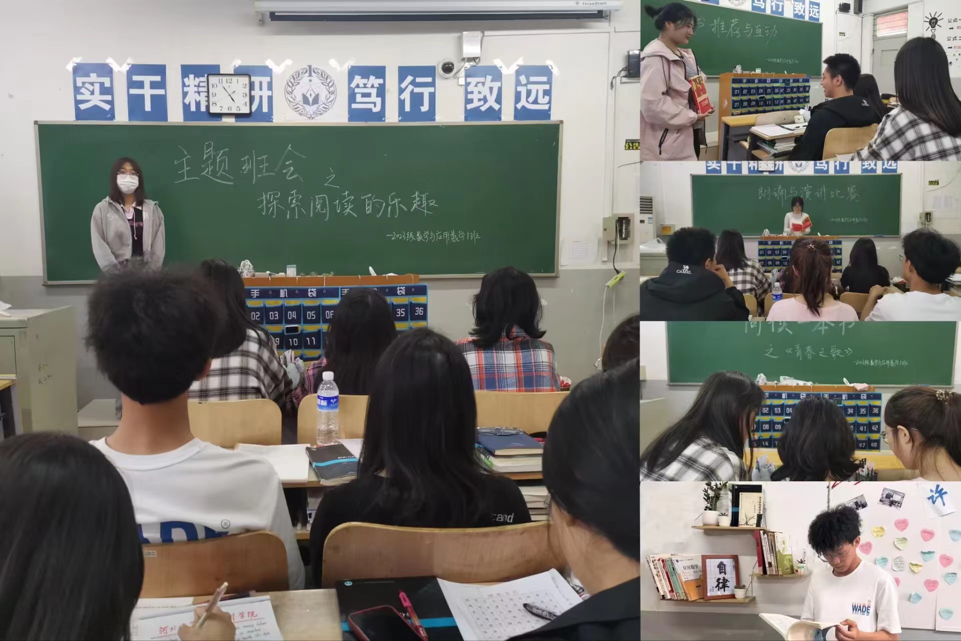 为了让同学们享受到读书的乐趣,增加同学之间的共同语言,提高同学们的文学素养和思想道德水平,2023级数学与应用数学1班于4月1日至4月29日在二教401教室组织全体同学开展了“最美人间四月天,书香浸润共奋进”读书月系列活动。 首先,在班委的组织下,成功举办了“万物皆数——数学与阅读辉映”活动,在此次活动中,同学们尽情的分享了与数学相关的书籍、人物等。其次,同学们在班级内共同设置了图书角。小小的图书角堆满了各种各样适合大学生的书籍,供同学们尽情阅读,享受好时光!在“共读《青春之歌》——感受思想的碰撞”活动中,通过共读《青春之歌》,建立起了共同的阅读记忆和体验,增强同学们彼此之间的交流和理解。“穿越时空的来信——我想对你说”中,同学们通过写信的形式与书中人物进行交流对话,与作者和书中的人物建立了一种特殊的情感纽带。在朗诵与演讲比赛中,同学们争相上台发言,台下的小伙伴们也积极踊跃,最后整个活动在欢喜氛围中结束。