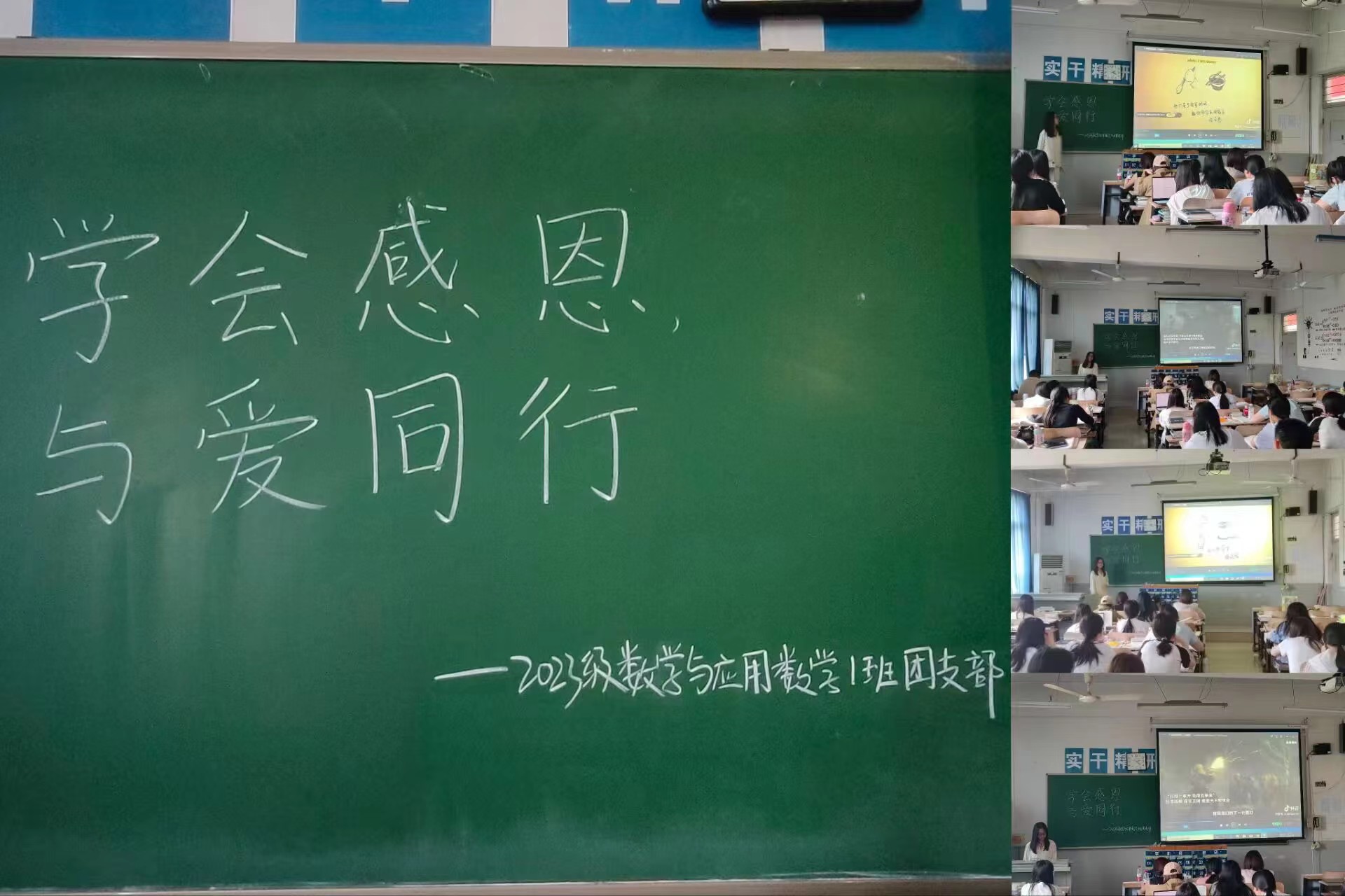 为引导同学们深入思考感恩的意义,唤起对爱的珍视与感悟,培养同学们的感恩之情,弘扬中华民族的传统美德,2023级数学与应用数学1班于2024年5月9日在二教401教室开展了“学会感恩,与爱同行”感恩教育主题班会。 会议伊始,生活委员崔佳宇以即将到来的母亲节为切入点,引导同学们回顾母亲的无私奉献与爱心,为后续感恩主题的讨论拉开了序幕。接着,通过播放一系列温馨感人的视频,展现了社会各界人士在日常生活中的感恩之情和付出爱心的行动。这些视频让同学们感受到了感恩的力量,激发了内心对爱与感恩的共鸣。随后,班会进入了互动环节。同学们纷纷分享了自己对感恩与爱的理解和感悟。有的同学讲述了家人朋友给予的支持和关爱,有的同学分享了自己参与志愿活动时的感受,更有的同学倾诉了自己在困境中得到的帮助和支持。这些真挚的分享让整个班级充满了温暖和感动,也让同学们更加深刻地认识到感恩的重要性。最后,崔佳宇邀请同学们在纸上写下自己的感想和感悟。在静谧的氛围中,同学们的笔触流淌着真情,文字里蕴含着深深的感恩与爱意。
