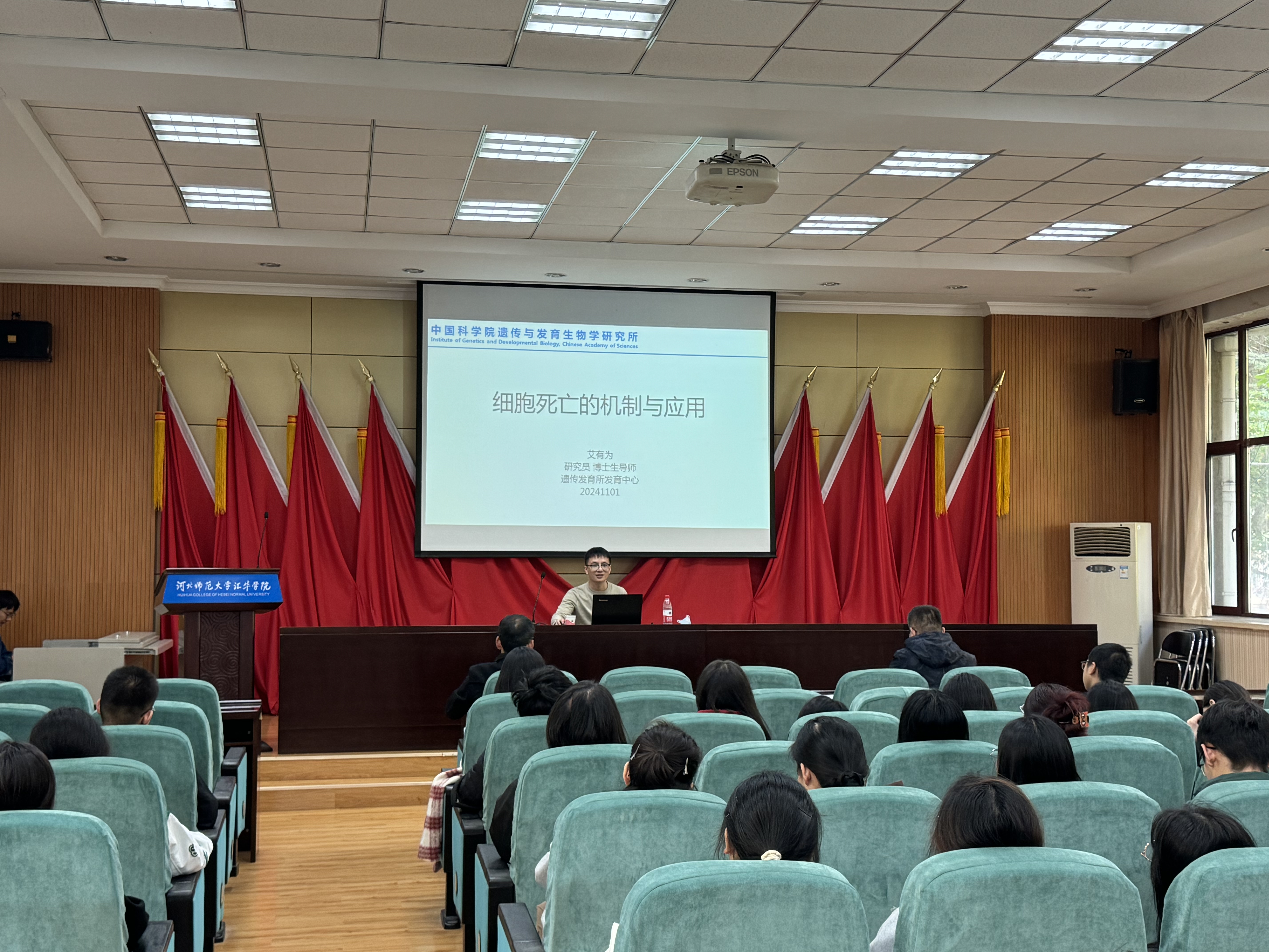 2024年11月2日,中国科学院遗传与发育生物学研究所研究员、博士生导师艾有,应邀做客米乐集团“汇华名家讲堂”,在图书馆一楼报告厅作题为“细胞死亡的机制与应用”的学术报告。理学部部长张增水主持讲座,理学部教学工作副部长、辅导员以及生物科学专业学生到场聆听。 艾有为首先分享了自己的学术成长历程,回顾了从本科到博士期间的学习和研究经历。他强调,扎实的基础知识和科研实践是推动科学进步的关键。详细介绍了团队的研究方向,重点讲解了在癌症治疗和传染病领域的研究进展,细胞死亡机制的研究不仅有助于深入理解疾病的本质,还为新药的研发提供了重要的理论基础和应用前景。艾老师通过生动的案例使在场的同学们对相关领域的前沿进展有了更加全面的认识。报告接近尾声时,艾有为老师与在场的学生进行了互动,耐心解答了同学们提出的问题,进一步激发了学生们的学习热情,也增强了他们对生物科学研究的兴趣。