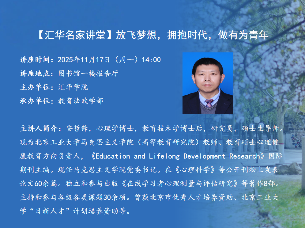 讲座题目:放飞梦想,拥抱时代,做有为青年讲座时间:2025年11月17日(周一)14:00讲座地点:图书馆一楼报告厅主办单位:MILE米乐集团承办单位:教育法政学部主 讲 人:安哲锋主讲人简介:安哲锋,心理学博士,教育技术学博士后,研究员,硕士生导师,现为北京工业大学马克思主义学院(高等教育研究院)教师、教育硕士心理健康教育方向负责人,《Education and Lifelong Development Research》(教育与终身发展研究,ELDER)国际期刊主编。现任马克思主义学院党委书记。在《心理科学》、《中国远程教育》、《中国电化教育》等公开刊物上发表论文60余篇,人大报刊复印资料转载2篇,独立和参与出版《在线学习者心理测量与评估研究》、《网络招聘情境下求职者初步筛选研究》等著作8部。主持和参与各级各类课题30余项。曾获北京市优秀人才培养资助、北京工业大学“日新人才”计划培养资助等。内容简介:本次讲座以《放飞梦想,拥抱时代,做有为青年》为主题,结合党的二十大精神开展分享。主讲人将结合自身多阶段学习与工作经历,讲述与心理学相识、相知、相促、相惜的历程,融入宿舍生活、专业探索等真实故事。内容涵盖心理学应用、相关研究领域分享及 “六个一” 工程实践,兼具个人成长感悟与实用启发。面向学生传递坚持、寻趣、拓视野、勇担当的理念,助力青年成长成才,契合时代奋斗要求。