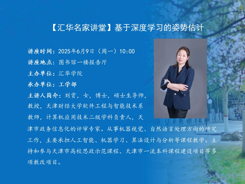 讲座题目:基于深度学习的姿势估计讲座时间:2025年6月9日(周一)9:00讲座地点:图书馆一楼报告厅主办单位:MILE米乐集团承办单位:工学部主 讲 人:刘赏主讲人简介:刘赏,女,博士,硕士生导师,教授,天津财经大学软件工程与智能技术系教师,计算机应用技术二级学科负责人,天津市政务信息化的评审专家。从事机器视觉、自然语言处理方向的研究工作,主要承担人工智能、机器学习、算法设计与分析等课程教学。主持和参与天津市高校思政示范课程、天津市一流本科课程建设项目等多项教改项目。近年来,主持完成教育部人文社科项目、天津市自然科学基金等多项项目,参与完成国家和省部级项目多项。主编著作1部,获得发明专利2项,软件著作权多项。在《International Journal of Machine Learning and Cybernetics》《Chaos, Solitons & Fractals》《计算机辅助设计与图形学学报》《模式识别与人工智能》等国内外核心刊物和国际会议上发表论文三十多篇,其中多篇被SCI、EI检索。