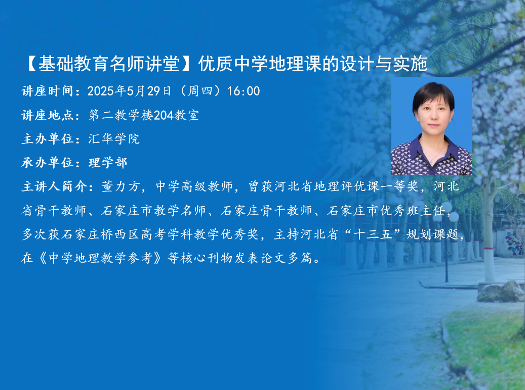 讲座题目:优质中学地理课的设计与实施讲座时间:2025年5月29日(周四)16:00讲座地点:第二教学楼204教室主办单位:MILE米乐集团承办单位:理学部主 讲 人:董力方主讲人简介:董力方,中学高级教师,曾获河北省地理评优课一等奖,河北省骨干教师、石家庄市教学名师、石家庄骨干教师、石家庄市优秀班主任,多次获石家庄桥西区高考学科教学优秀奖,主持河北省“十三五”规划课题,在《中学地理教学参考》等核心刊物发表论文多篇。内容简介:结合教学创新实践、听评课感悟、教育教研心得、高考导向等,对优质中学地理课的设计与实施中各环节的要点进行总结和研讨,辅以教学设计案例分析,促进同学们改进教学理念,提升教学技能。