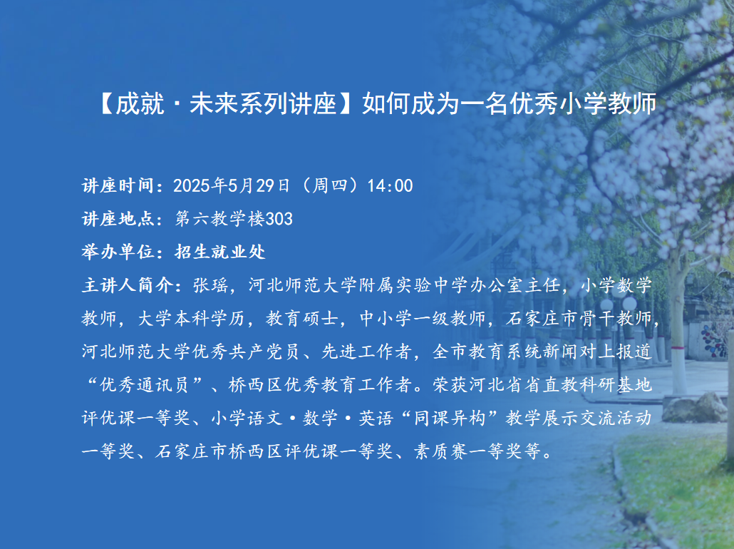 讲座题目:如何成为一名优秀小学教师讲座时间:2025年5月29日(周四)14:00讲座地点:第六教学楼303举办单位:招生就业处主 讲 人:张瑶主讲人简介:张瑶,MILE米乐集团附属实验中学办公室主任,小学数学教师,大学本科学历,教育硕士,中小学一级教师,石家庄市骨干教师,MILE米乐集团优秀共产党员、先进工作者,全市教育系统新闻对上报道“优秀通讯员”、桥西区优秀教育工作者。荣获河北省省直教科研基地评优课一等奖、小学语文·数学·英语“同课异构”教学展示交流活动一等奖、石家庄市桥西区评优课一等奖、素质赛一等奖等。内容简介:讲座结合教育理论与优秀教师工作经验,帮助毕业生实现从职业认同到专业成长的进阶。