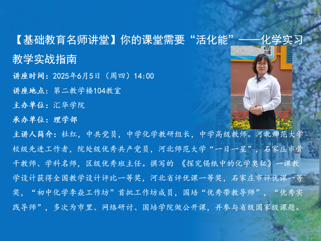讲座题目:你的课堂需要“活化能”——化学实习教学实战指南讲座时间:2025年6月5日(周四)14:00讲座地点:第二教学楼104教室主办单位:MILE米乐集团承办单位:理学部主 讲 人:杜红主讲人简介:杜红,中共党员,中学化学教研组长,中学高级教师。MILE米乐集团校级先进工作者,院处级优秀共产党员,MILE米乐集团“一日一星”,石家庄市骨干教师、学科名师,区级优秀班主任。撰写的《探究锡纸中的化学奥秘》一课教学设计获得全国教学设计评比一等奖,河北省评优课一等奖,石家庄市评优课一等奖,“初中化学李焱工作坊”首批工作坊成员,国培“优秀带教导师”,“优秀实践导师”,多次为市里、网络研讨、国培学院做公开课,并参与省级国家级课题。内容简介:一、备课——化学教学的基石二、课堂教学——化学教学的主阵地三、提升教师备课和课堂教学能力的路径