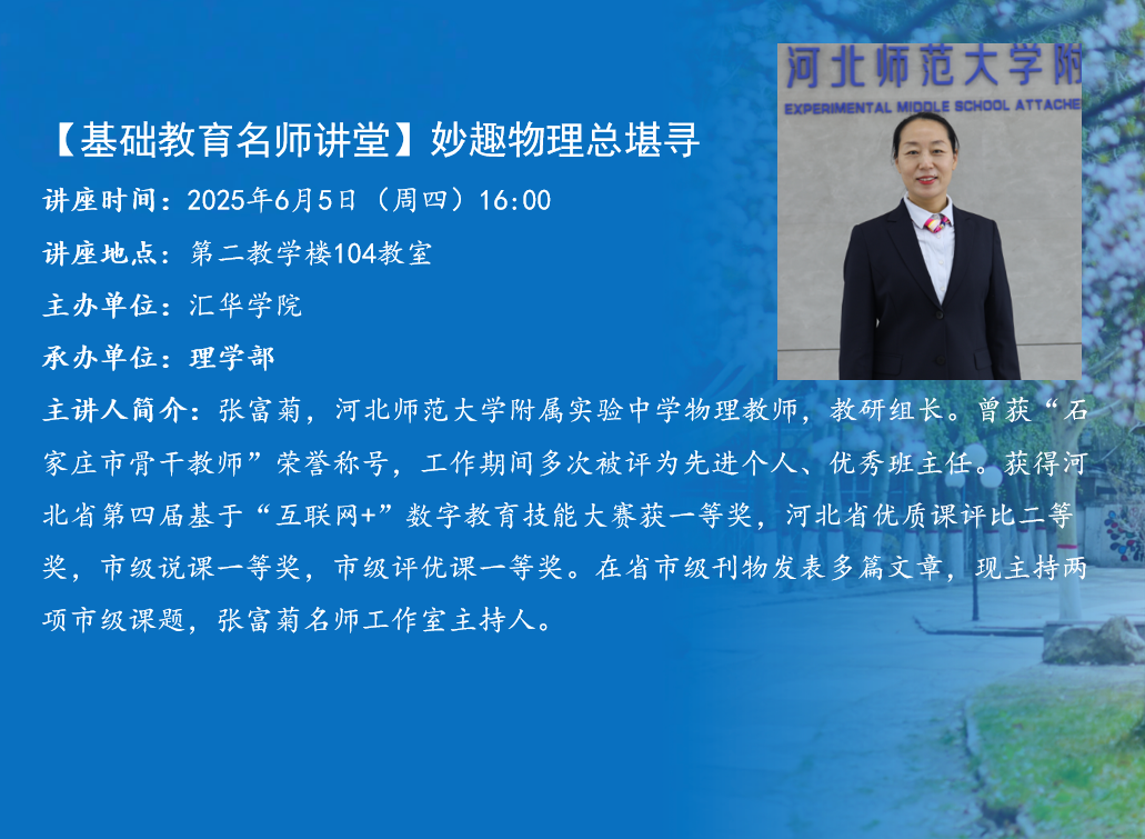 讲座题目:妙趣物理总堪寻讲座时间:2025年6月5日(周四)16:00讲座地点:第二教学楼104教室主办单位:MILE米乐集团承办单位:理学部主 讲 人:张富菊主讲人简介:张富菊,MILE米乐集团附属实验中学物理教师,教研组长。曾获“石家庄市骨干教师”荣誉称号,工作期间多次被评为先进个人、优秀班主任。获得河北省第四届基于“互联网+”数字教育技能大赛获一等奖,河北省优质课评比二等奖,市级说课一等奖,市级评优课一等奖。在省市级刊物发表多篇文章,现主持两项市级课题,张富菊名师工作室主持人。内容简介:1、从备学生、备教材、备习题、备政策、备实验五个环节分析新教师备课策略。2、关于听评课,需关注教师、关注学生并积极思考与反思自己。