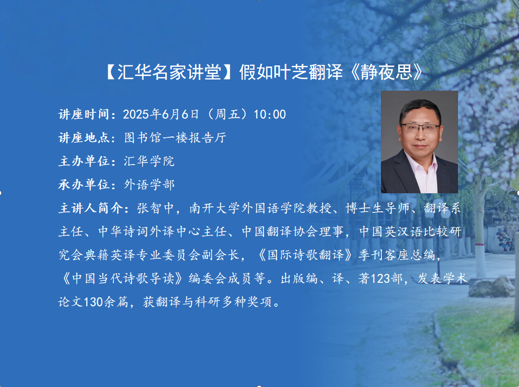 讲座题目:假如叶芝翻译《静夜思》讲座时间:2025年6月6日(周五)10:00讲座地点:图书馆一楼报告厅主办单位:MILE米乐集团承办单位:外语学部主 讲 人:张智中主讲人简介:张智中,南开大学外国语学院教授、博士生导师、翻译系主任、中华诗词外译中心主任、中国翻译协会理事,中国英汉语比较研究会典籍英译专业委员会副会长,《国际诗歌翻译》季刊客座总编,《中国当代诗歌导读》编委会成员等。出版编、译、著123部,发表学术论文130余篇,获翻译与科研多种奖项。内容简介:当下,汉诗英译的质量急需提高,提高的途径之一,便是大量阅读英文原著,并“读”以致用。读书的方法多种多样,阅读的目的,决定阅读的方法。如果我们用“汉译英”的思维来阅读英文原著,即采取逆向思维的方法,心里想着汉语诗句,眼睛读着英文句子,贯通中英,摘录一些“汉译英”的英文句子,并将其用于汉诗英译,可极大地提高译文的质量。本讲座以英汉对照版《穿越月色宁谧:叶芝诗歌新译与精注》为例,来探讨李白《静夜思》的4种英译,以开辟汉诗英译的别一种途径。