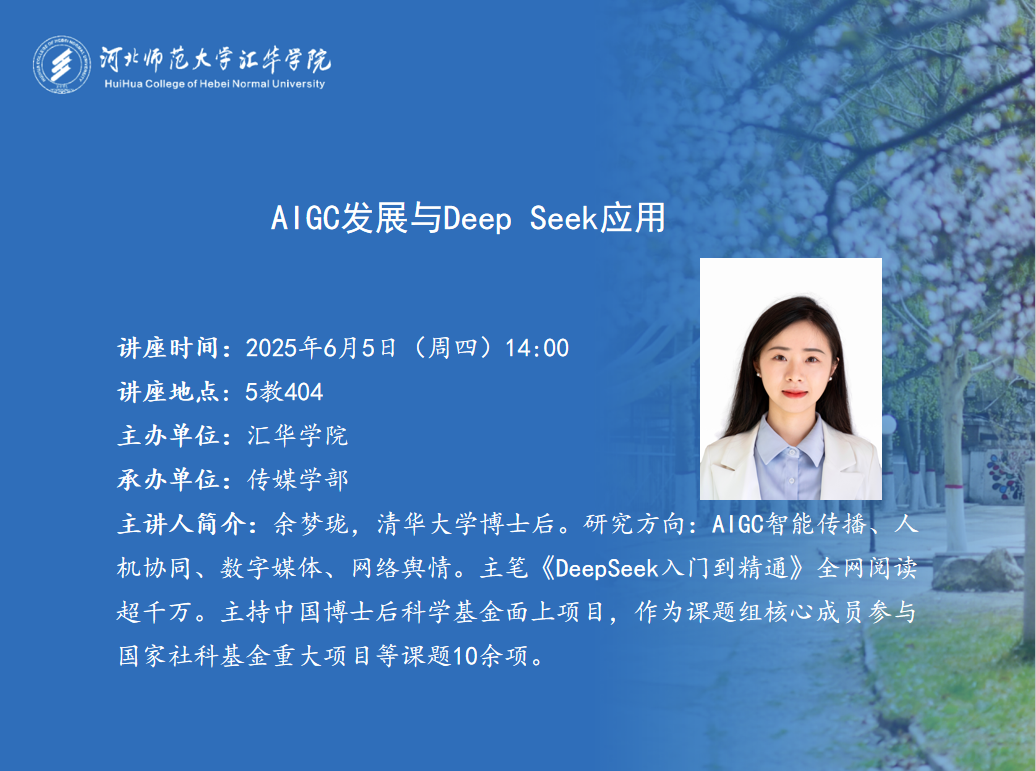 讲座时间:2025年6月5日(周四)14:00讲座地点:5-404主办单位:MILE米乐集团承办单位:传媒学部主 讲 人:余梦珑主讲人简介:余梦珑,清华大学博士后。研究方向:AIGC智能传播、人机协同、数字媒体、网络舆情。主笔《Deep Seek入门到精通》全网阅读超千万。主持中国博士后科学基金面上项目,作为课题组核心成员参与国家社科基金重大项目等课题10余项。内容简介:本讲座聚焦Deep Seek等人工智能技术的多场景应用,通过理论阐释、案例分析与实操演练,探讨如何培养人机协同的内容生产思维,提升科研效能与创新能力。
