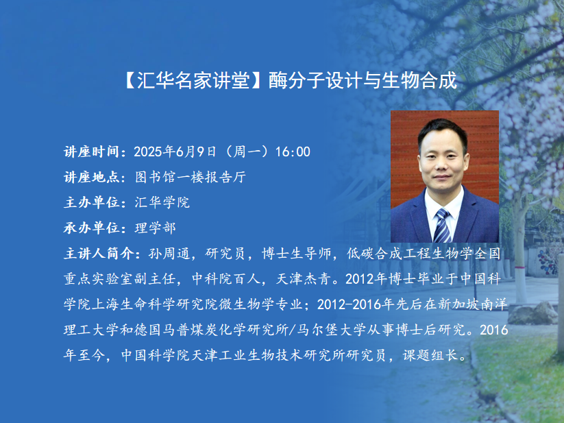 讲座题目:酶分子设计与生物合成讲座时间:2025年6月9日(周一)16:00讲座地点:图书馆一楼报告厅主办单位:MILE米乐集团承办单位:理学部主 讲 人:孙周通主讲人简介:孙周通,研究员,博士生导师,低碳合成工程生物学全国重点实验室副主任,中国科学院百人,天津杰青。2012年博士毕业于中国科学院上海生命科学研究院微生物学专业;2012-2016年先后在新加坡南洋理工大学和德国马普煤炭化学研究所/马尔堡大学从事博士后研究。2016年至今,中国科学院天津工业生物技术研究所研究员,课题组长。担任期刊Green Synthesis & Catalysis、Bioresources and Bioprocessing编委,生物学杂志副主任委员,生物工程学报编委;中国生物化学与分子生物学会酶学专业分会委员,中国微生物学会酶工程专委会委员,中国生物发酵产业协会酶制剂分会理事,中国生物发酵产业协会第四届全国发酵工程技术工作委员会委员,中国科协天津市科技工作者协会监事长等。团队围绕工业酶设计与绿色生物催化,重点开展酶分子工程、代谢工程与合成生物学等方向的基础与应用研究。近年来在领域主流期刊Nat Synth,Nat Commun,Chem Rev,Chem Soc Rev,JACS,Angew Chem,Metab Eng等发表论文90余篇,主编参编酶工程专著5部,申请/授权中国发明专利40余项,获2021年中国微生物学会优秀青年酶工程学家奖,2022年天津市自然科学特等奖等。内容简介:酶是生命演化的核心功能单元,是合成生物学解析遗传与进化的金钥匙。大自然经过几十亿年的进化赋予人类丰富的酶资源宝库,也为生命向高阶进化提供了基础。虽然酶作为催化剂被广泛应用于人类生产生活的多方面,如:医药与健康、能源与材料、食品与环境等,但对其结构与功能的认知依然非常有限,而且其自然属性(天然功能)与应用属性(活性、稳定性和选择性)之间的不匹配阻碍了对酶资源的有效利用。酶的突变是其功能进化的源动力,但由于酶分子序列空间极其庞大,尤其针对手性(镜像)控制的设计缺乏有效手段,因此对其开展高效设计拓展其催化能力的边界充满挑战。酶分子工程通过降维设计和有限进化(筛选)可以有效解决新酶设计与新反应实现的困境。报告以酶蛋白氨基酸密码子降维设计为基础,将计算设计与有限进化相结合以解决序列空间搜索瓶颈,助力新酶新反应设计在手性催化及生物合成中的应用。