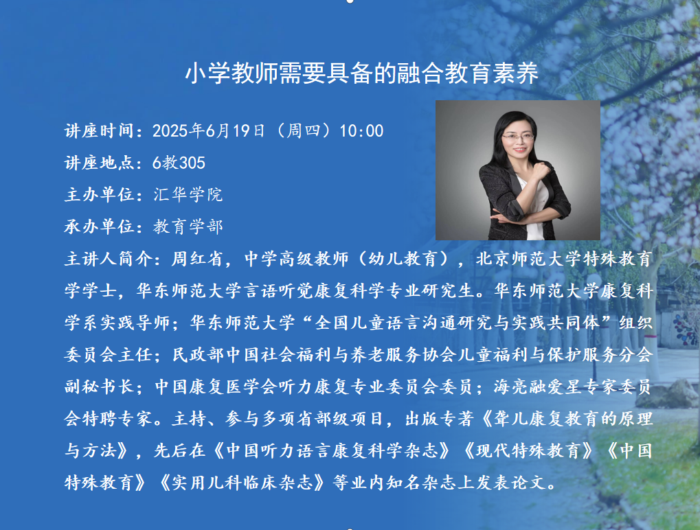 讲座题目:小学教师需要具备的融合教育素养讲座时间:2025年6月19日(周四)10:00讲座地点:6教305主办单位:MILE米乐集团承办单位:教育学部主 讲 人:周红省主讲人简介:周红省,中学高级教师(幼儿教育),北京师范大学特殊教育学学士,华东师范大学言语听觉康复科学专业研究生。华东师范大学康复科学系实践导师;华东师范大学“全国儿童语言沟通研究与实践共同体”组织委员会主任;华东师范大学“幸福之花孤独症群体庇护性就业研究与实践项目”特聘专家;北京师范大学教育学部校友会上海分会副会长;民政部中国社会福利与养老服务协会儿童福利与保护服务分会副秘书长;中国康复医学会听力康复专业委员会委员;海亮融爱星专家委员会特聘专家;上海小小虎幼稚园(融合教育)首任园长;多所高校客座教授、多所特校名誉校长、多家康复中心名誉主任。浙江省教育厅省培课程《小学教师(资源教师)教育康复技术研修班》负责人。研究领域:特殊需要儿童教育康复的理论与方法,教育康复课程设置和机构管理,特殊需要儿童融合教育,“心青年”庇护性就业。曾主持、参与多项省部级项目,出版专著《聋儿康复教育的原理与方法》,先后在《中国听力语言康复科学杂志》《现代特殊教育》《中国特殊教育》《实用儿科临床杂志》等业内知名杂志上发表《1+ X +Y康复教育模式的实践研究》《生成课程在“1+X+Y”康复教育模式中的实践研究》《渐进式融合教育模式》等论文10余篇。2015年获上海市科技进步二等奖。从事特殊需要儿童康复教育/融合教育/“心青年”庇护性就业的理论及实践研究、师资培训、家长培训30余年,先后在全国31个省份的特教、残联、民政系统的国家级、省级培训班讲课,在80余所高校做学术讲座和大学生创业/创新指导。讲座主要包括6个方面的内容:1、小学教育转型发展面临的困局与挑战2、社交沟通障碍儿童小学融合教育支持策略3、注意力缺陷多动障碍儿童小学融合教育支持策略4、学困儿童小学融合教育支持策略5、情绪行为障碍儿童小学融合教育支持策略6、小学融合教育指导典型案例分享
