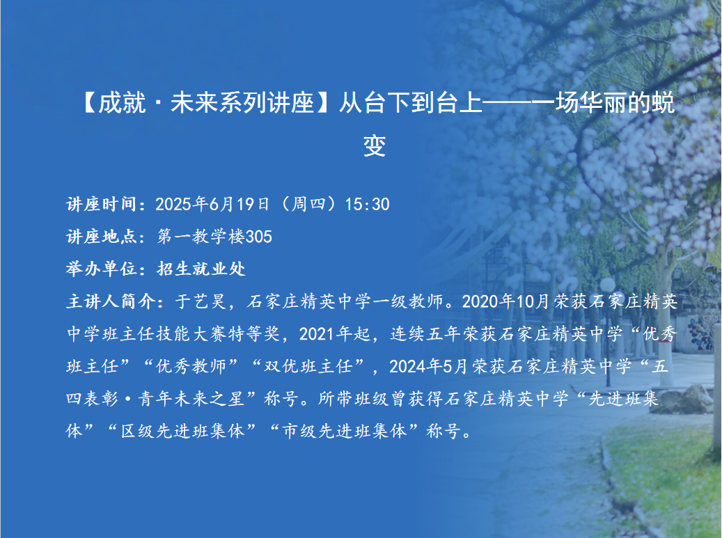 讲座题目:从台下到台上——一场华丽的蜕变讲座时间:2025年6月19日(周四)15:30讲座地点:第一教学楼305举办单位:招生就业处主 讲 人:于艺昊主讲人简介:于艺昊,石家庄精英中学一级教师。2020年10月荣获石家庄精英中学班主任技能大赛特等奖,2021年3月起,连续五年荣获石家庄精英中学“优秀班主任”“优秀教师”“双优班主任”,2024年5月荣获石家庄精英中学“五四表彰·青年未来之星”称号。所带班级曾获得石家庄精英中学“先进班集体”“区级先进班集体”“市级先进班集体”称号。内容简介:结合自身实际经验,对毕业生进行职业发展教育,助力大学生明确职业航向、增强就业实力。