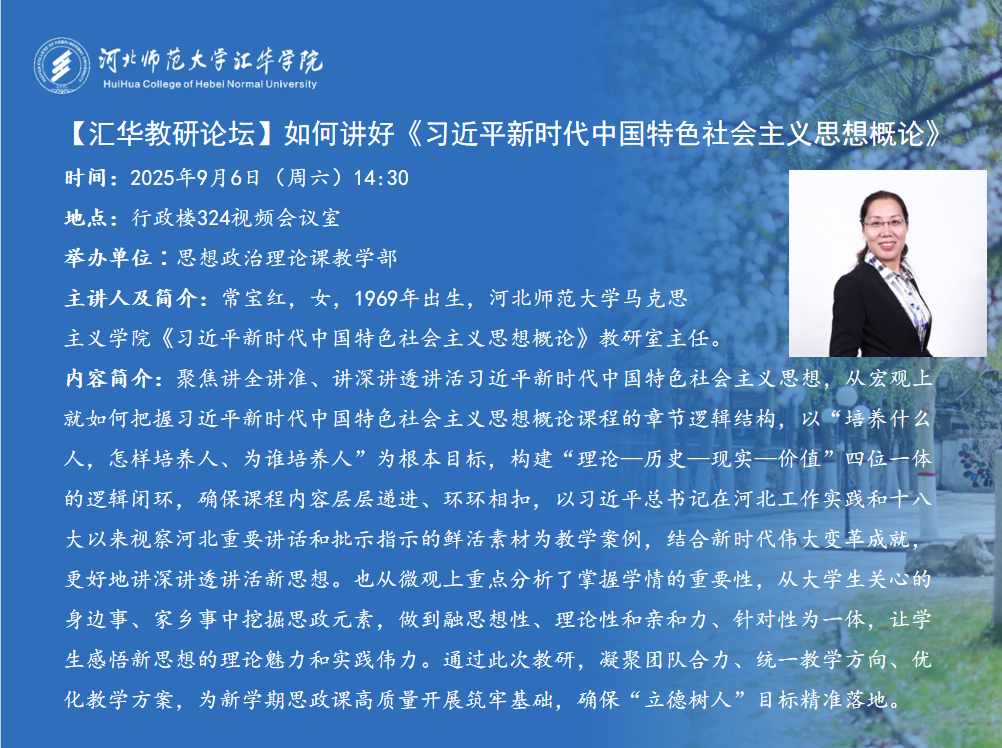 题目:如何讲好《习近平新时代中国特色社会主义思想概论》时间:2025年9月6日(周六)14:30地点:行政楼324视频会议室举办单位∶思想政治理论课教学部主讲人及简介:常宝红,女,1969年出生,副教授,MILE米乐集团马克思主义学院《习近平新时代中国特色社会主义思想概论》教研室主任。内容简介:聚焦讲全讲准、讲深讲透讲活习近平新时代中国特色社会主义思想从宏观上就如何把握习近平新时代中国特色社会主义思想概论课程的章节逻辑结构,以“培养什么人,怎样培养人、为谁培养人”为根本目标,构建“理论——历史——现实——价值”四位一体的逻辑闭环,确保课程内容层层递进、环环相扣,以习近平总书记在河北工作实践和十八大以来视察河北重要讲话和批示指示的鲜活素材为教学案例,结合新时代伟大变革成就,更好地讲深讲透讲活新思想。也从微观上重点分析了掌握学情的重要性,从大学生关心的身边事、家乡事中挖掘思政元素,做到融思想性、理论性和亲和力、针对性为一体,让学生感悟新思想的理论魅力和实践伟力。通过此次教研,凝聚团队合力、统一教学方向、优化教学方案,为新学期思政课高质量开展筑牢基础,确保“立德树人”目标精准落地。