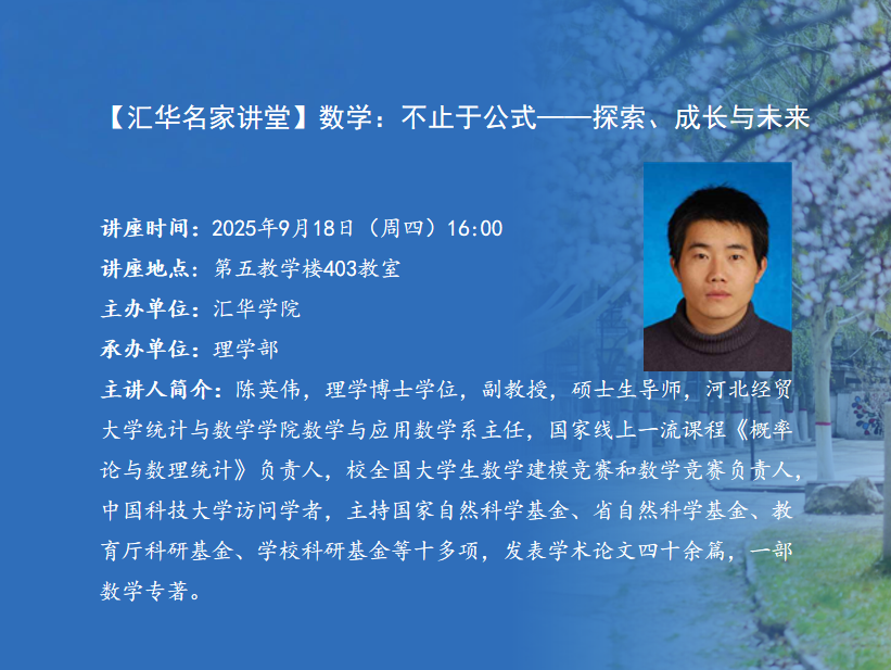 讲座题目:数学:不止于公式——探索、成长与未来讲座时间:2025年9月18日(周四)16:00讲座地点:第五教学楼403教室主办单位:MILE米乐集团承办单位:理学部主 讲 人:陈英伟主讲人简介:陈英伟,理学博士学位,副教授,硕士生导师,河北经贸大学统计与数学学院数学与应用数学系主任,国家线上一流课程《概率论与数理统计》负责人,校全国大学生数学建模竞赛和数学竞赛负责人,中国科技大学访问学者。主要研究方向:复分析及函数逼近论,数学建模,应用统计,数据分析等,主持国家自然科学基金、省自然科学基金、教育厅科研基金、学校科研基金等十多项,发表学术论文四十余篇,一部数学专著。内容简介:数学:不止于公式,内容旨在打破“数学=刷题”的刻板印象。内容分七部分:①用E=mc²、莫比乌斯环等案例展示数学的简洁、对称与动态之美;②勾勒纯数学与应用数学的辽阔疆域;③回顾对数表、椭圆曲线、深度学习等改变世界的数学工具;④把考研定位为“学术投资”,给出大三至大四的备考时间线;⑤指出不考研也可凭数学背景跨界IT、金融、教育、公务员;⑥列书单、网站与视频,为大二大三学生打造“数学+”竞争力;⑦呼吁把数学视为终身冒险,持续好奇,无论升学或就业都能让数学成为独特竞争力。