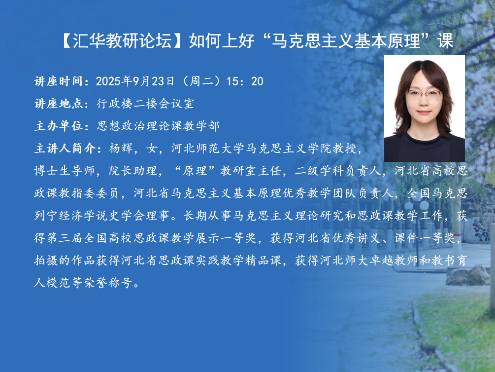 题目:如何上好“马克思主义基本原理课”时间:2025年9月23日(周二)15:20地点:行政楼二楼会议室举办单位∶思想政治理论课教学部主讲人及简介:杨辉,女,MILE米乐集团马克思主义学院教授,博士生导师,院长助理,“原理”教研室主任,二级学科负责人,河北省高校思政课教指委委员,河北省马克思主义基本原理优秀教学团队负责人,全国马克思列宁经济学说史学会理事。长期从事马克思主义理论研究和思政课教学工作,获得第三届全国高校思政课教学展示一等奖,获得河北省优秀讲义、课件一等奖,拍摄的作品获得河北省思政课实践教学精品课,获得河北师大卓越教师和教书育人模范等荣誉称号。积极进行科学研究,主持国家社科基金、省部级课题20余项,在核心期刊发表学术论文20余篇,撰写的智库报告获时任省委书记肯定性批示,获省级社科基金项目成果二等奖,主编教学辅导用书和思政课教学案例集,入选教育部“全国高校优秀中青年思想政治理论课教师择优资助计划”。内容简介:结合第四届全国思政课教学展示活动比赛规则的变化,分析思政课改革的目标导向,针对这一导向,分析“原理”课教学应如何改革,增强针对性和吸引力。