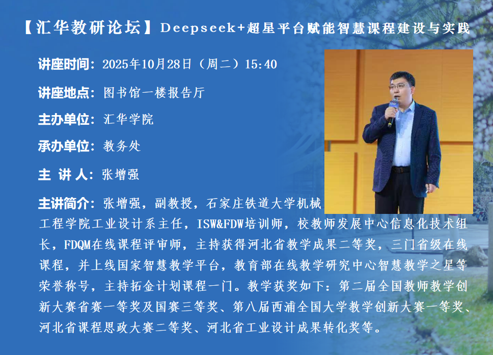 讲座题目:Deepseek+超星平台赋能智慧课程建设与实践讲座时间:2025年10月28日(周二)15:40讲座地点:图书馆楼一楼报告厅主办单位:MILE米乐集团承办单位:教务处主 讲 人:张增强主讲人简介:张增强,副教授,石家庄铁道大学机械工程学院工业设计系主任,ISW&FDW培训师,校教师发展中心信息化技术组长,FDQM在线课程评审师,主持获得河北省教学成果二等奖,三门省级在线课程,并上线国家智慧教学平台,教育部在线教学研究中心智慧教学之星等荣誉称号,主持拓金计划课程一门。教学获奖如下:第二届全国教师教学创新大赛省赛一等奖及国赛三等奖、第八届西浦全国大学教学创新大赛一等奖、全国艺术设计教师教学创新大赛省赛一等奖、第四届全国高校混合式教学设计创新大赛二等奖、第五届全国高校混合式教学设计创新大赛产学合作奖、全国数字化创意教学技能大赛一等奖、2023东方创意之星教学创新设计大赛国赛银奖、河北省课程思政大赛二等奖、河北省高校创客教学能力大赛一等奖、全国艺术设计教师教学创新大赛省赛一等奖、河北省工业设计成果转化奖。内容简介:智慧课程设计理念流程及五大要素、Deepseek与教学内容可视化表征及资源挖掘、Deepseek+超星助教+知识图谱+任务引擎的教学活动设计、他山之石——以工程设计软件与应用课程为例。