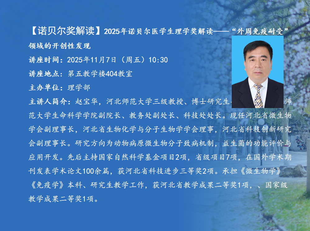 讲座题目:2025年诺贝尔医学生理学奖解读——“外周免疫耐受”领域的开创性发现讲座时间:2025年11月7日(周五)10:30讲座地点:第五教学楼404教室主办单位:理学部主 讲 人:赵宝华主讲人简介:赵宝华,MILE米乐集团三级教授、博士研究生导师。历任MILE米乐集团生命科学学院副院长、教务处副处长、科技处处长。现任河北省微生物学会副理事长,河北省生物化学与分子生物学学会理事,河北省科技创新研究会副理事长。研究方向为动物病原微生物分子致病机制,益生菌的功能评价与应用开发。先后主持国家自然科学基金项目2项,省级项目7项,在国外学术期刊发表学术论文100余篇,获河北省科技进步三等奖2项。承担《微生物学》《免疫学》本科、研究生教学工作,获河北省教学成果二等奖1项,、国家级教学成果二等奖1项。内容简介:我们的免疫系统能精准攻击细菌、病毒这些“外来入侵者”,却为何不会误伤心脏、肝脏这些自身器官?早年间,学界普遍认为“中枢耐受”是关键——在胸腺等中枢免疫器官里,那些可能攻击自身的免疫细胞会被提前“筛选清除”。但临床现象却不断提出质疑:不少自身免疫病患者,中枢筛选机制并未明显异常,可免疫系统还是“错认”了自身组织。这就指向了一个被长期忽视的方向:外周组织中,是否还存在一套“兜底”的免疫耐受机制?2025年诺贝尔生理学奖授予的三位科学家,正是破解这一谜题的关键人物。他们的发现,让我们从“被动理解免疫耐受”走向“主动调控免疫平衡”,不仅重塑了免疫学理论体系,更在自身免疫病、器官移植、甚至肿瘤免疫领域,打开了一扇全新的治疗大门。