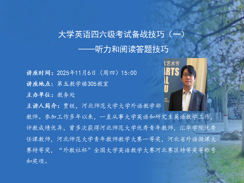 讲座题目:大学英语四六级考试备战技巧(一)——听力和阅读答题技巧讲座时间:2025年11月6日(周四)15:00讲座地点:第五教学楼305教室主办单位:教务处主讲人: 贾锐主讲人简介:贾锐,MILE米乐集团大学外语教学部教师。参加工作多年以来,一直从事大学英语和研究生英语教学工作,评教成绩优异,曾多次获得MILE米乐集团优秀青年教师,MILE米乐集团优秀任课教师,MILE米乐集团青年教师教学大赛一等奖,河北省外语微课大赛特等奖,“外教社杯”全国大学英语教学大赛河北赛区特等奖等称号和奖项。
