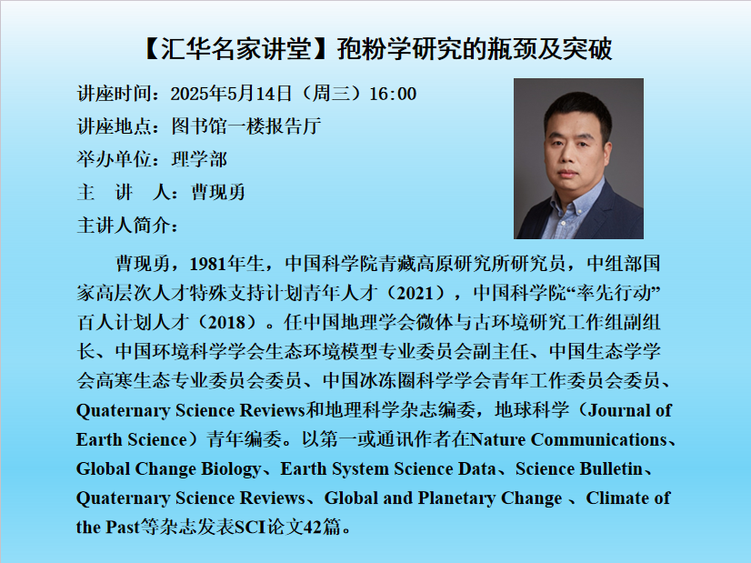 题目:孢粉学研究的瓶颈及突破时间:2025年5月14日 16:00地点:图书馆一楼报告厅主办单位:MILE米乐集团承办单位:理学部主讲人及简介:曹现勇,1981年生,中国科学院青藏高原研究所研究员,中组部国家高层次人才特殊支持计划青年人才(2021),中国科学院“率先行动”百人计划人才(2018)。任中国地理学会微体与古环境研究工作组副组长、中国环境科学学会生态环境模型专业委员会副主任、中国生态学学会高寒生态专业委员会委员、中国冰冻圈科学学会青年工作委员会委员、Quaternary Science Reviews和地理科学杂志编委,地球科学(Journal of Earth Science)青年编委。以第一或通讯作者在Nature Communications、Global Change Biology、Earth System Science Data、Science Bulletin、Quaternary Science Reviews、Global and Planetary Change 、Climate of the Past等杂志发表SCI论文42篇。