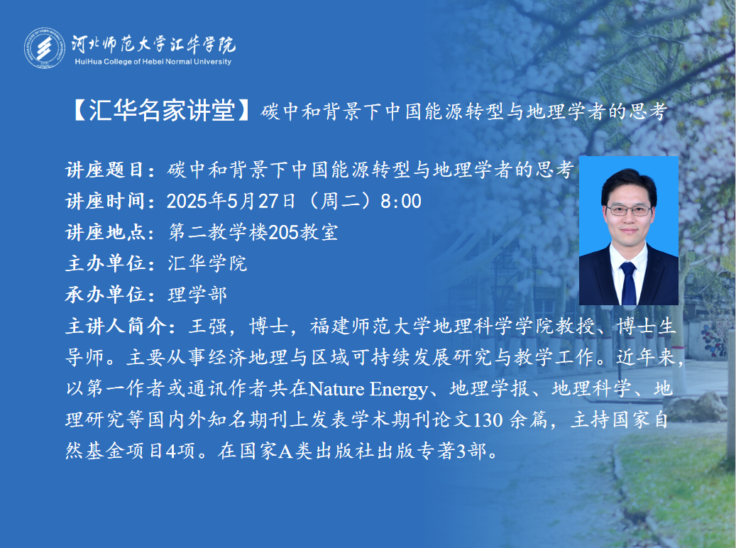 讲座题目:碳中和背景下中国能源转型与地理学者的思考讲座时间:2025年5月27日(周二)8:00讲座地点:第二教学楼205教室主办单位:MILE米乐集团承办单位:理学部主讲人:王强主讲人简介:王强,男,博士,福建师范大学地理科学学院教授、博士生导师。主要从事经济地理与区域可持续发展研究与教学工作。近年来,以第一作者或通讯作者共在Nature Energy、Landscape and Urban Planning、Sustainable Cities and Society、Applied Energy、Renewable Energy、Energy、地理学报、地理科学、地理研究等国内外知名期刊上发表学术期刊论文130余篇,主持国家自然基金项目4项。在国家A类出版社出版专著3部。研究成果获得福建省社科一等奖1项、青年佳作奖1项,民政部行政理论研究三等奖1项。获福建省青年教师教学能手、思政教学名师称号,主持省级重大教改项目1项,获教学成果奖二等奖2项。内容简介:在碳中和背景下,中国能源转型不仅是技术革新与政策驱动的过程,更是一场深刻的地理空间重构。地理学者需以系统性视角剖析能源生产与消费的空间失衡。地理学以其跨学科优势,正为构建人地协调的碳中和路径提供科学支撑,助力中国在能源革命中实现生态保护、经济转型与区域公平的多维共赢。