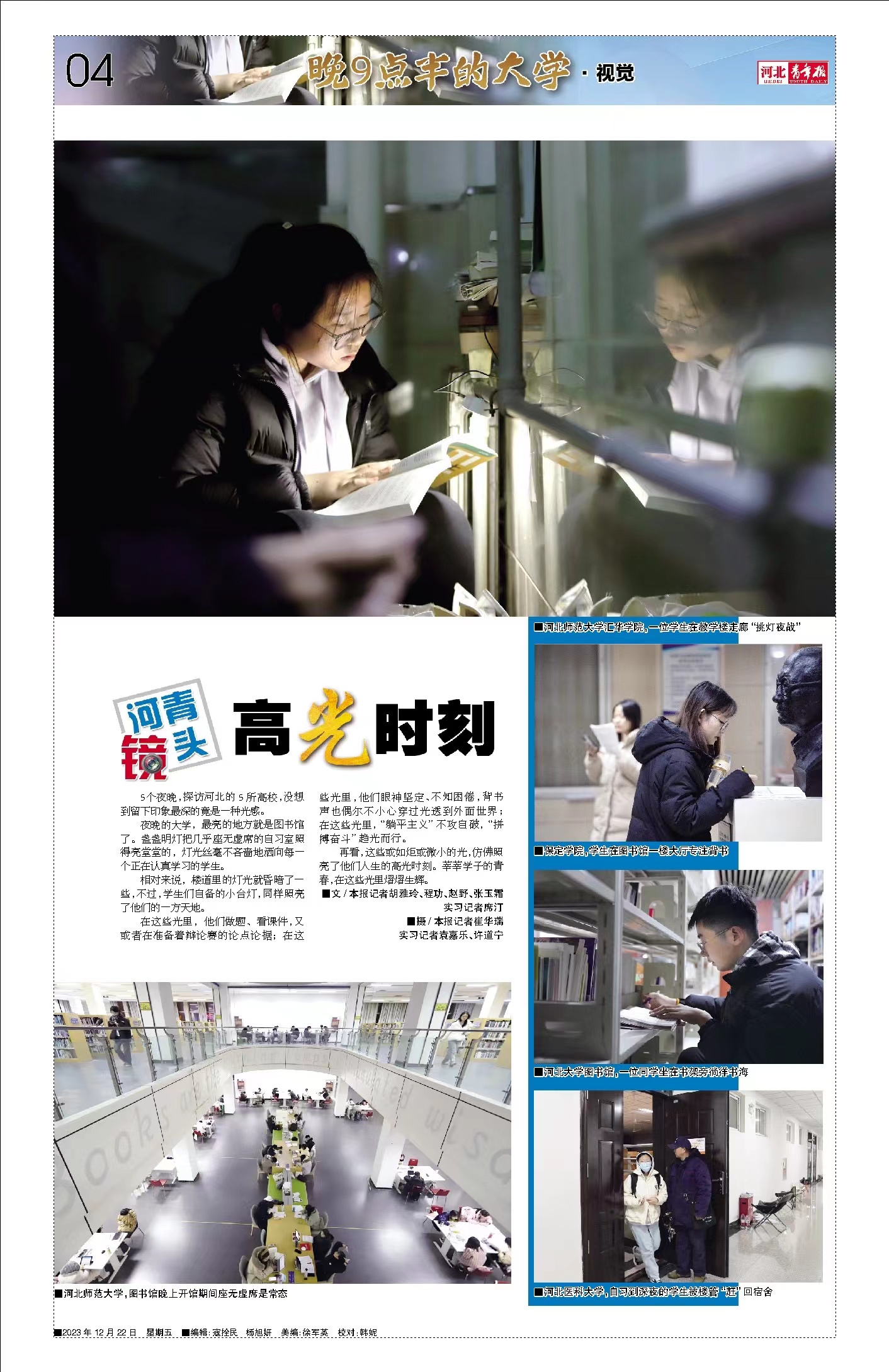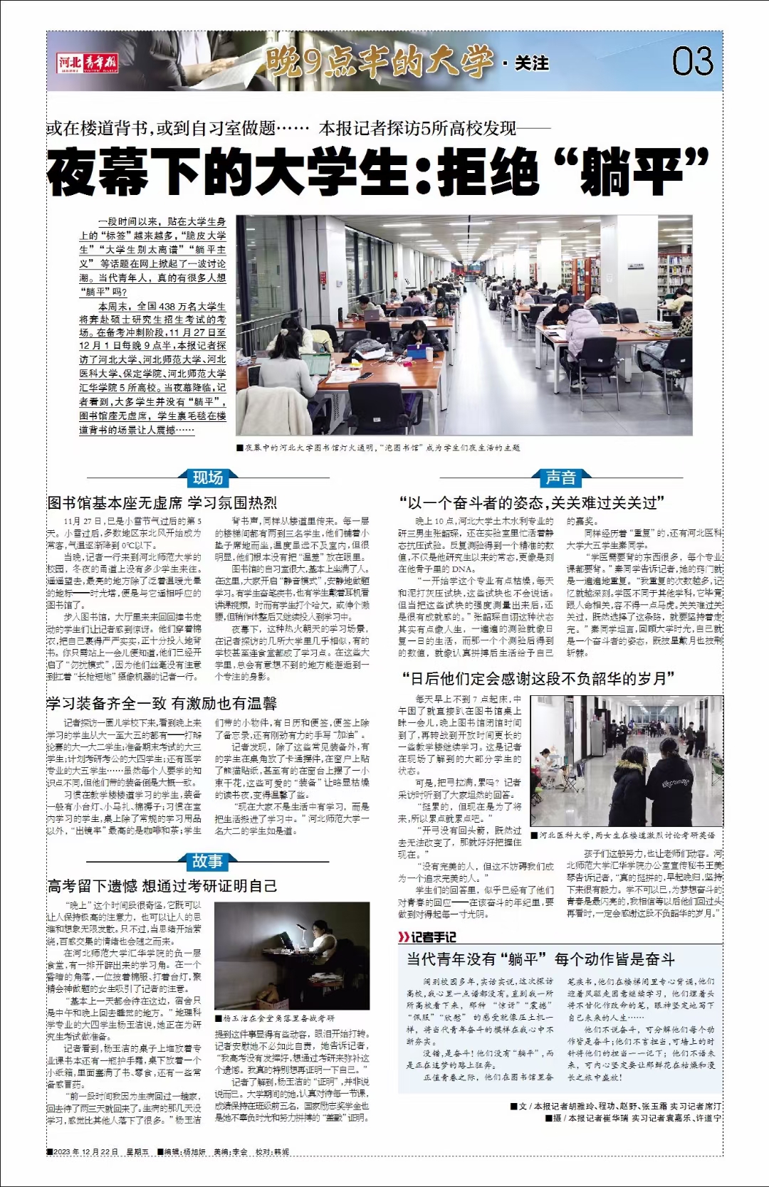 12月20日,河北青年报官方微信视频号、官方抖音豆青新闻同步发布视频《晚9点半的大学》,河北青年报微信公众号发布专题推送《大学生“躺平”了?记者探访河大、师大、医大......看到图片时泪目了》,12月22日,河北青年报3版4版发布专题《夜幕下的大学生:拒绝“躺平”》,报道了MILE米乐集团、MILE米乐集团、河北大学、河北医科大学、保定学院5所高校的考研学习氛围。
