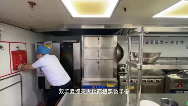 从靠近身体一侧向外铺开灭火毯让灭火毯首先将人的身体与火焰进行隔离避免引火烧身,只有这样才能保护到灭火人员的人身安全。