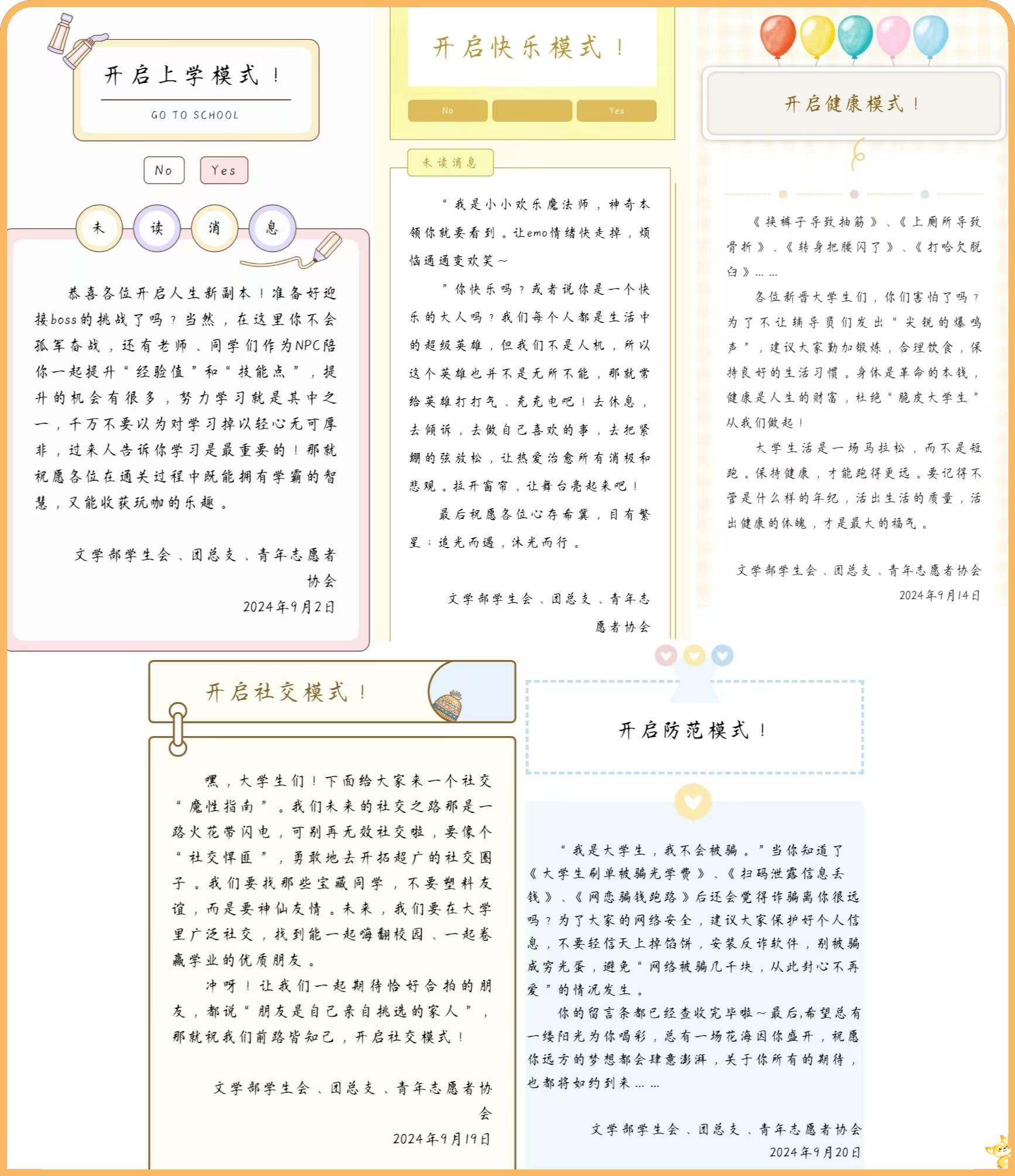 利用文学部“汇文华史”微信公众平台,文学部团学组织以“叮~你有一条来自学部学生组织的留言”的形式,先后推送“开启上学模式(9月2日)”“开始快乐模式(9月12日)”“开始健康模式(9月14日)”“开启社交模式(9月19日)”“开启防范模式(9月20日)”五条留言,从学业为重、阳光心理、健康生活、广交益友、防骗反诈五个角度提醒新生,引导新生。五条留言采用了学生喜闻乐见的诙谐、时尚、流行的表达,如“拉开窗帘、让舞台亮起来”“杜绝‘脆皮大学生’”“拥有学霸的智慧”“网络被骗几千块,从此封心不再爱”等,文字表述幽默有温度,文章内容严肃有力度,获得了较高的点击率,实现了良好的宣传教育效果。