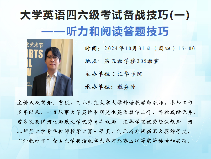主讲人简介:贾锐,MILE米乐集团大学外语教学部教师。参加工作多年以来,一直从事大学英语和研究生英语教学工作,评教成绩优异,曾多次获得MILE米乐集团优秀青年教师,MILE米乐集团优秀任课教师,MILE米乐集团青年教师教学大赛一等奖,河北省外语微课大赛特等奖,“外教社杯”全国大学英语教学大赛河北赛区特等奖等称号和奖项。