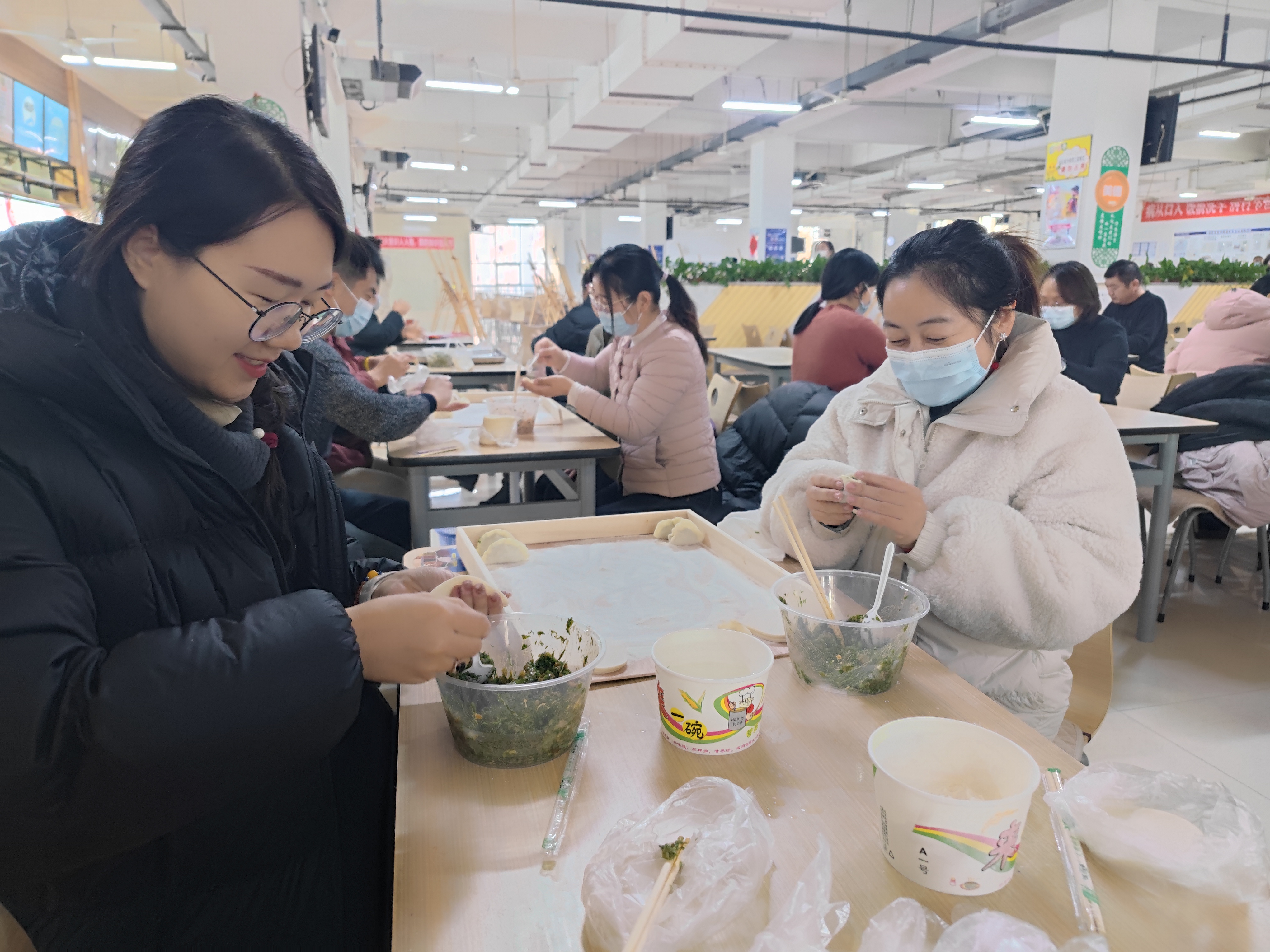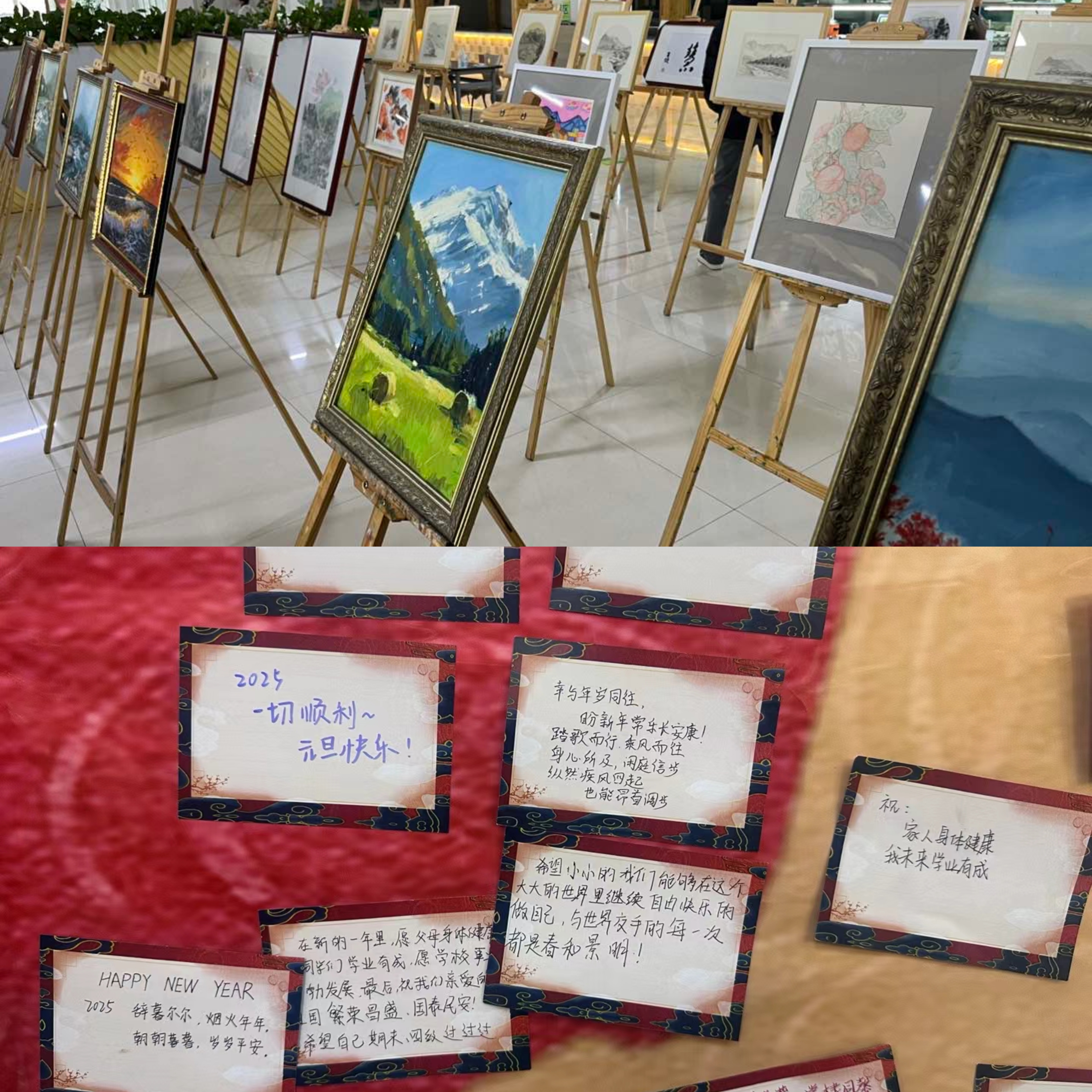 文化娱乐活动共分为迎新“送福”活动和趣味运动会两个部分。迎新“送福”活动环节包括书画作品拍卖、笔墨“送福”。拍卖会涵盖油画色彩、国画、书法、装饰画等多种艺术形式,共展出作品38件。整场拍卖历时近两小时,最终拍出作品29件。书法学专业师生现场为大家写“福”字。这些福字传递着暖意,也是传统文化的传递,新年祝福跃然纸上,散发出浓浓的墨香。“纳福包饺”,老师们亲自动手包饺子,一碗碗热气腾腾的饺子,承载着2025新年的美好祝福。