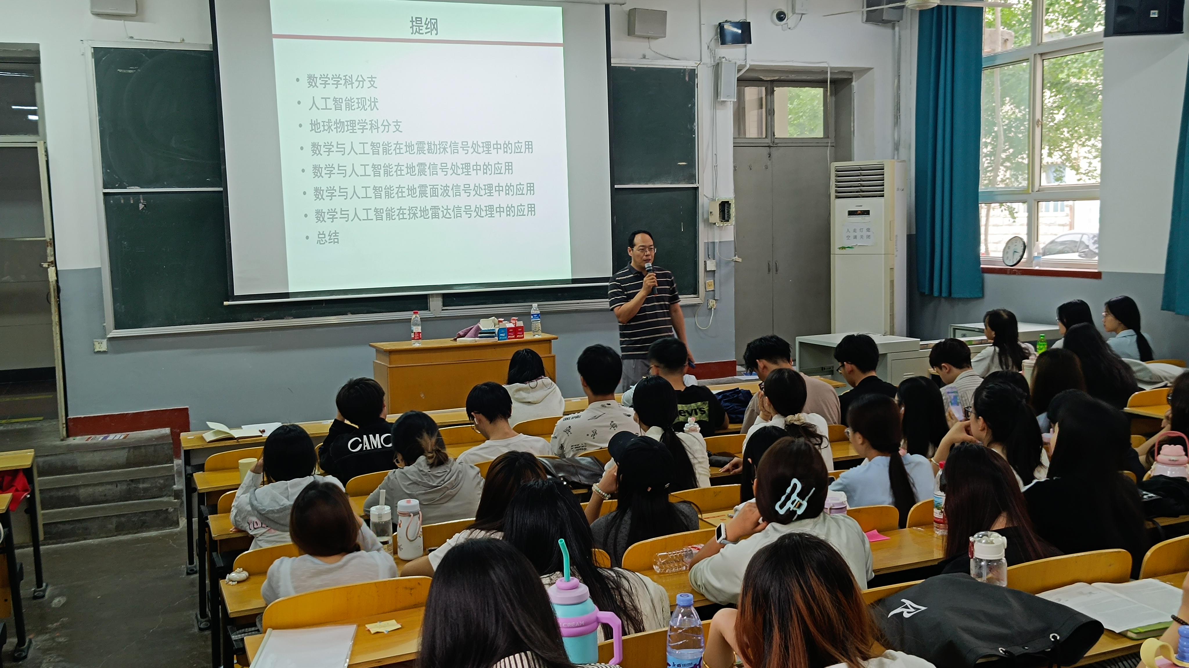 曹静杰首先讲解了数学与应用数学专业二级学科目录,之后,结合自身的求学经历回顾了从事数学专业学习与研究方向的选择历程,鼓励同学们学好数学专业基础知识,在学科交叉领域寻找发展方向。他从数学与其他学科的联系出发,分享了数学与人工智能发展的关系,介绍了他所从事的研究领域---数学与地球物理;从数学与人工智能在地震勘探信号处理中的应用、数学与人工智能在地震信号处理中的应用、数学与人工智能在地震面波信号处理中的应用和数学与人工智能在探地雷达信号处理中的应用等四个方面,详细阐述了数学在这些领域中的价值和意义。