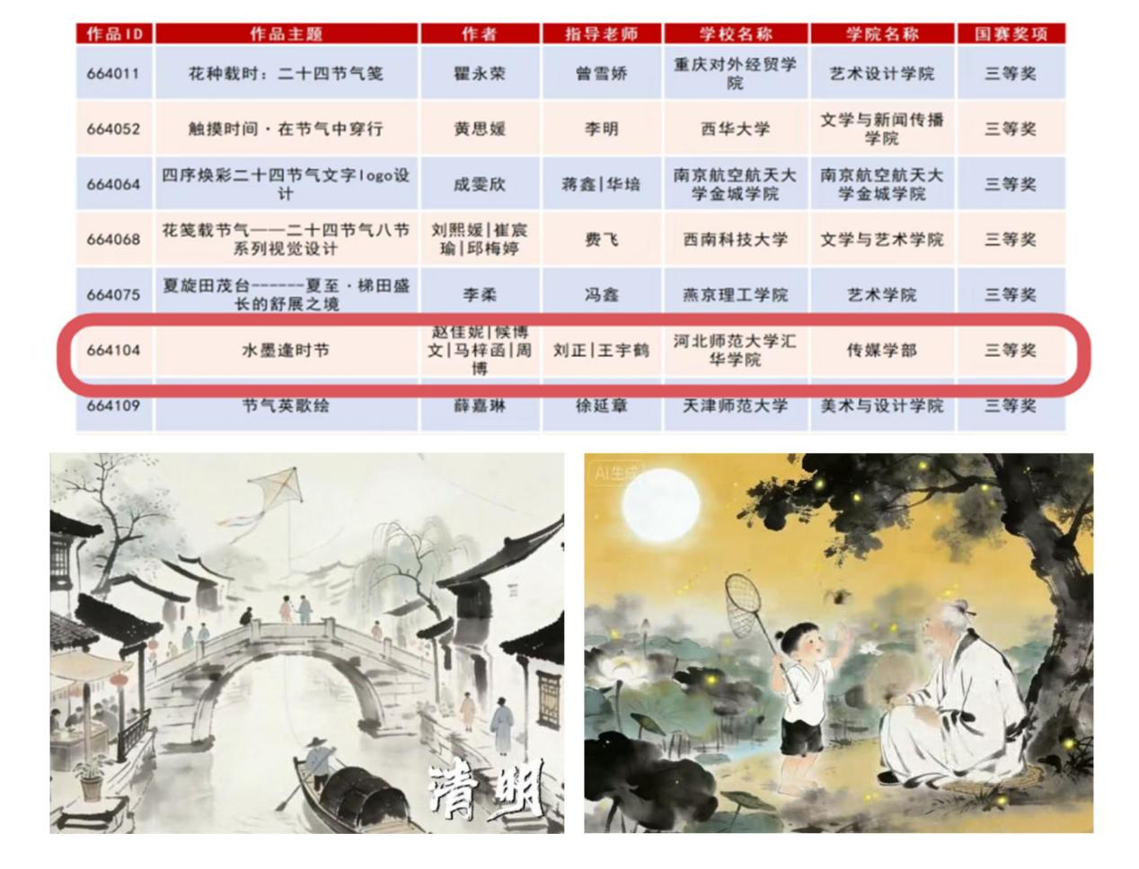 2月17日至18日,2026第十届“米兰设计周——中国高校设计学科师生优秀作品展”中的二十四节气文化作品设计大赛获奖结果正式公布。在学部老师指导下,2024级新闻学专业赵佳妮、广告学专业马梓函、广播电视编导专业侯博文、周博团队的视频作品《水墨逢时节》荣获国赛三等奖。