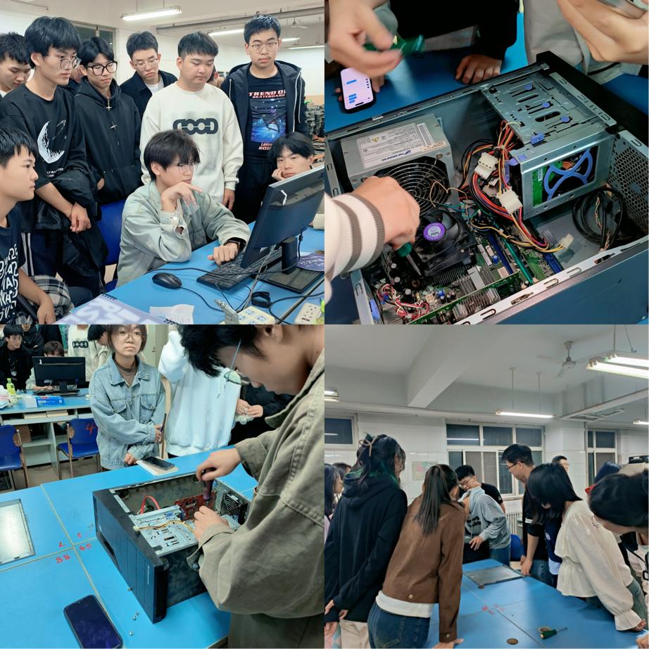 随后,进入电脑拆装机环节。电脑小分队成员小心翼翼地将电脑拆开,一边操作一边讲解各个部件的名称和功能,以及拆装机的正确方法和顺序。他们强调了操作过程中的安全问题,提醒新生们要谨慎对待电脑硬件。新生们纷纷围拢过来,近距离观察电脑内部结构,对这个平时看似神秘的“黑匣子”有了更直观的认识。