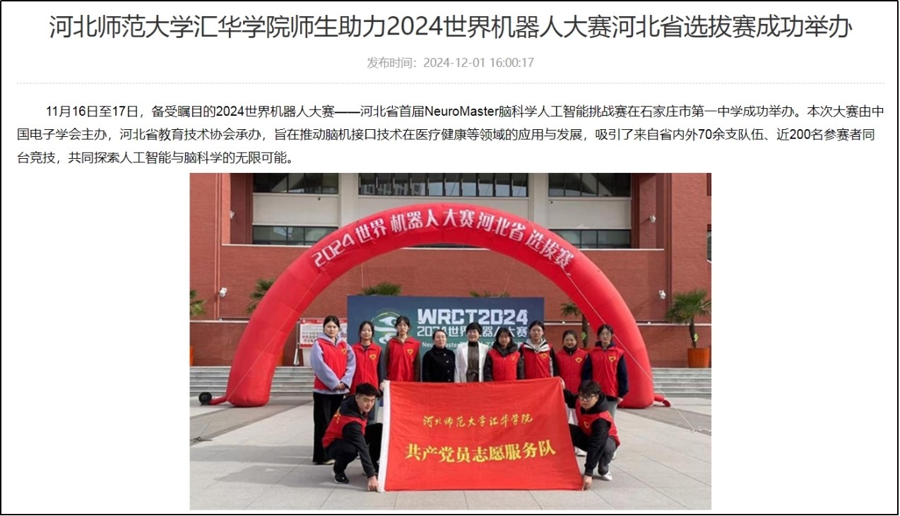 11月16日至17日,备受瞩目的2024世界机器人大赛——河北省首届NeuroMaster脑科学人工智能挑战赛在石家庄市第一中学圆满落幕。本次大赛由中国电子学会主办,河北省教育技术协会承办,旨在推动脑机接口技术在医疗健康等领域的应用与发展,吸引了来自省内外70余支队伍、近200名参赛者同台竞技,共同探索人工智能与脑科学的无限可能。米乐集团12名师生在赛事中分别担任了裁判长、裁判员及志愿者等角色,共同展现了一次党员志愿服务精神与教学改革创新成果深度融合的生动实践。