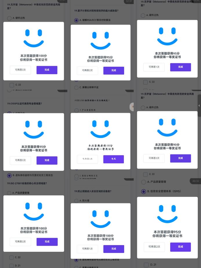 以赛促提升:网络安全竞赛塑造就业“加分项”。小组以赛促练提升就业“硬实力”,依托线上平台组织团队成功开展第二届网络安全主题网络知识竞赛。竞赛设置前端安全、数据加密等多类实战题型,学生通过模拟真实攻防场景,深化对Web安全开发规范的理解,同时有效锻炼了快速排查问题的工程实践能力。