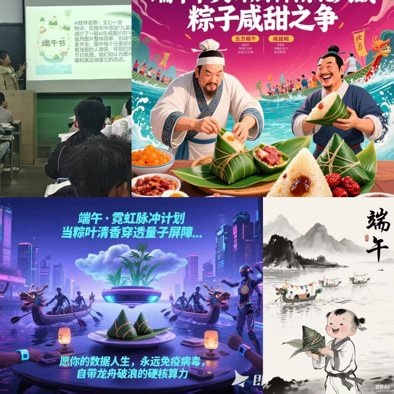 比赛开始,陈雪明确了活动目的,鼓励大家将传统文化与现代AI技术相结合,创作出独具特色的作品。每个宿舍推选一名非班委同学参赛,海报制作要求使用AI生成不少于三张风格各异的图片,并融入端午相关文字。即梦、豆包、可灵等AI创作工具成为同学们手中的“魔法棒”,助力他们将奇思妙想变为现实。