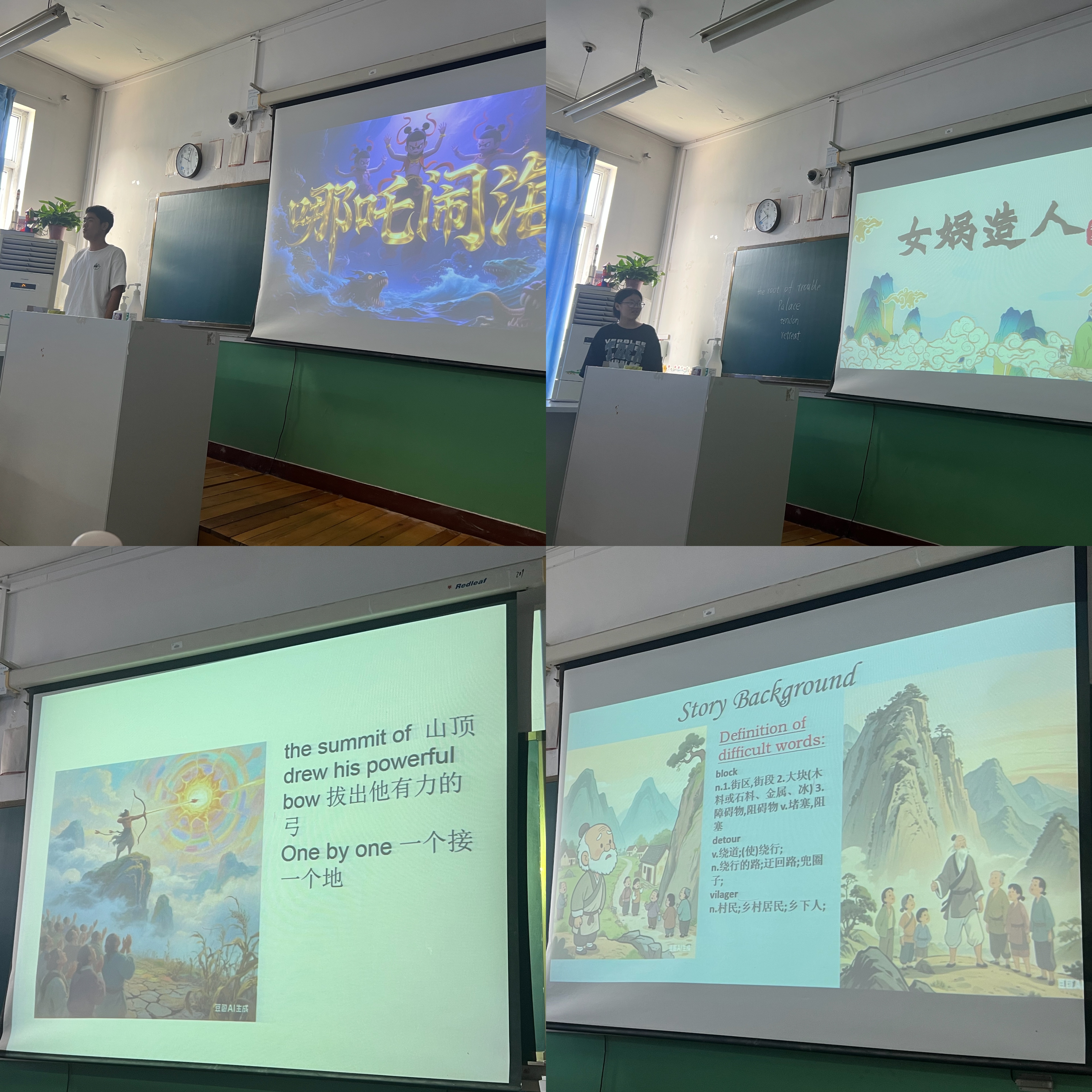 活动现场,8个宿舍的同学依次登场,将中华优秀传统文化与英语表达巧妙融合。其中,3号楼533宿舍以精彩的演绎讲述了“哪吒闹海”的故事,用流利的英语,生动展现了哪吒不畏强权、敢于抗争的英勇形象;3号楼513宿舍带来的“夸父逐日”故事,凭借丰富的肢体语言和抑扬顿挫的语调,把夸父追逐太阳、坚韧不拔的精神展现得淋漓尽致;而2号楼426宿舍讲述的“精卫填海”,则让同学们感受到了精卫锲而不舍、永不言弃的毅力。除了这些神话故事,同学们还分享了诸如“愚公移山”等体现中华传统美德的故事,从不同角度展现了中华优秀传统文化的魅力。