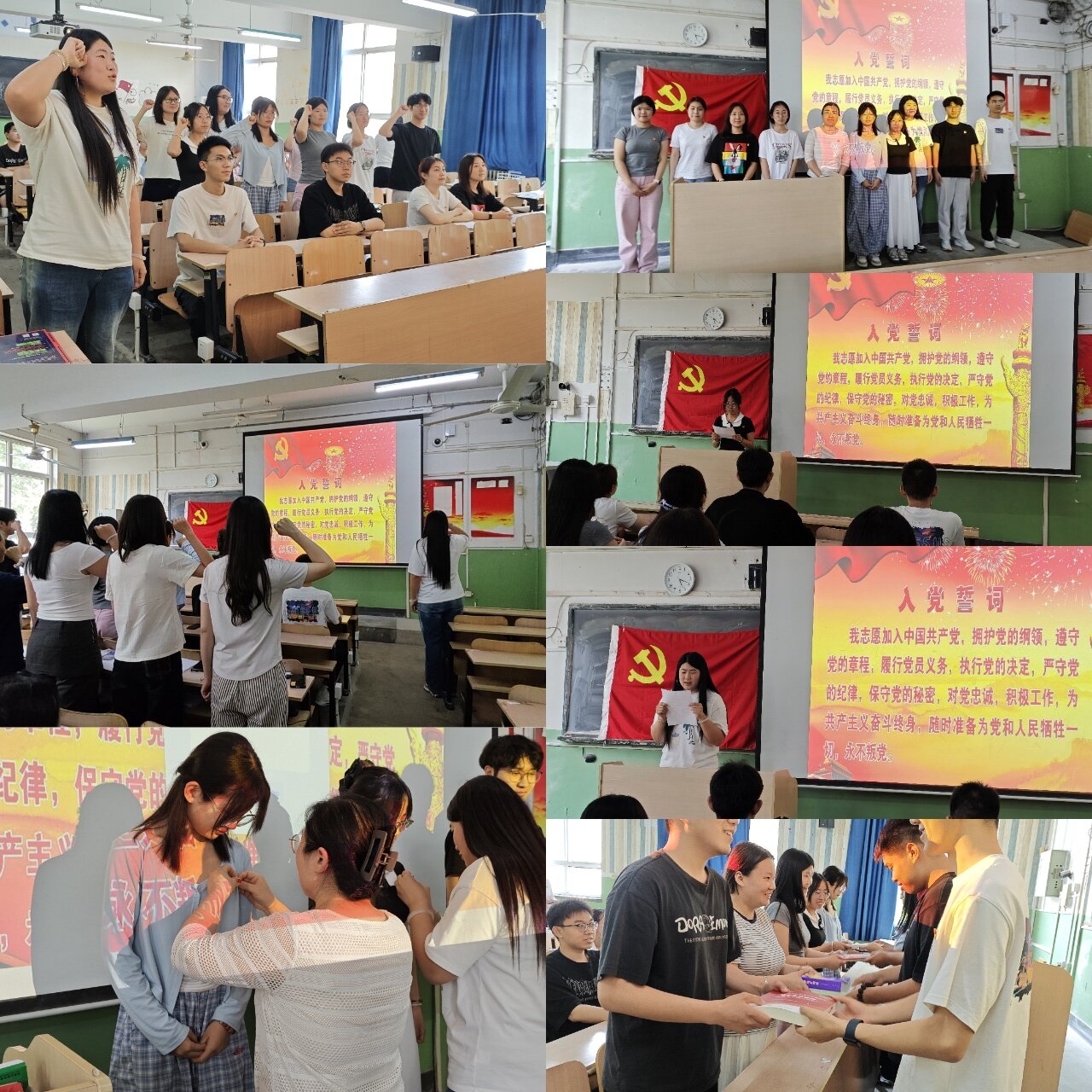 在活动的重要环节,毕业生优秀党员为新发展党员逐一佩戴党员徽章,这一庄重的仪式不仅是对新党员的欢迎,更标志着精神的传承。随后本学期新发展党员进行入党宣誓,面向党旗,举起右拳,庄严宣誓:“我志愿加入中国共产党……”铿锵有力的誓言在会场回荡,表达了新党员对党的忠诚和坚定信念。毕业生党员代表梁琪雅同志在发言中分享了自己在大学期间的党员经历和感悟。她表示,党员身份不仅是荣誉,更是责任。在未来的工作岗位上,她将时刻以党员的标准严格要求自己,充分发挥先锋模范作用,为党和人民的事业贡献自己的力量。同时,她也希望在校生党员能够珍惜在校时光,不断提升政治素养和专业能力,为未来的发展打下坚实基础。