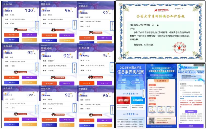 为提升团队实战水平,信息安全小组积极组织大家参与全国竞赛。在第二届全国大学生网络安全知识竞赛中,学生凭借扎实的专业知识斩获佳绩,备赛过程强化了理论基础与团队协作能力;第四届"应急科普华夏行"竞赛为学生提供了知识应用平台;在2025年全国大学生信息素养挑战赛上,学生冷静应对复杂题目,展现出卓越的专业素养;通过全国网络安全答题活动进一步帮助学生们查漏补缺,提升技能。